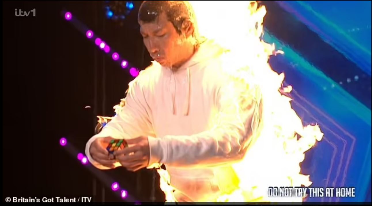 في مشهد صادم لجمهور مشاهدين التليفزيون البريطاني، ظهر في برنامج شهير للكشف عن المواهب إنتقد المشاهدين عرضا لأحد المتسابقين تفاجؤا أنه يشعل النار في نفسه و يحاول حل لغز مكعب "روبيك" المعروف بصعوبة حله في الظروف العادية.
