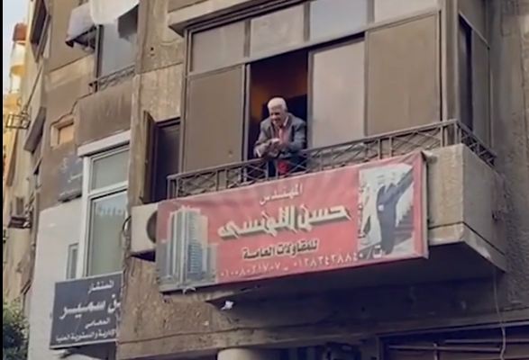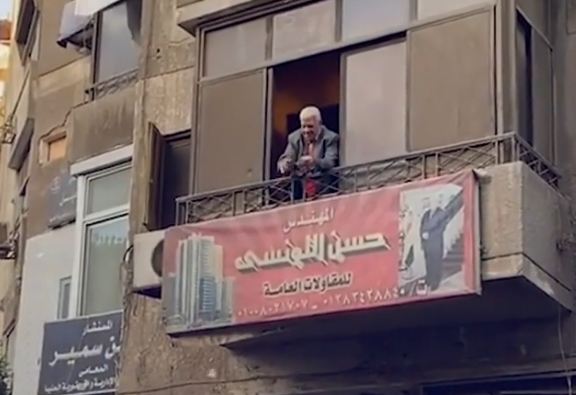 وقام المهندس حسين التونسي، للمقاولات العامة، وهو الاسم الذي تحمله اللافتة المعلقة على مكتبه، بإلقاء وتوزيع "العيدية" من شرفة المنزل.