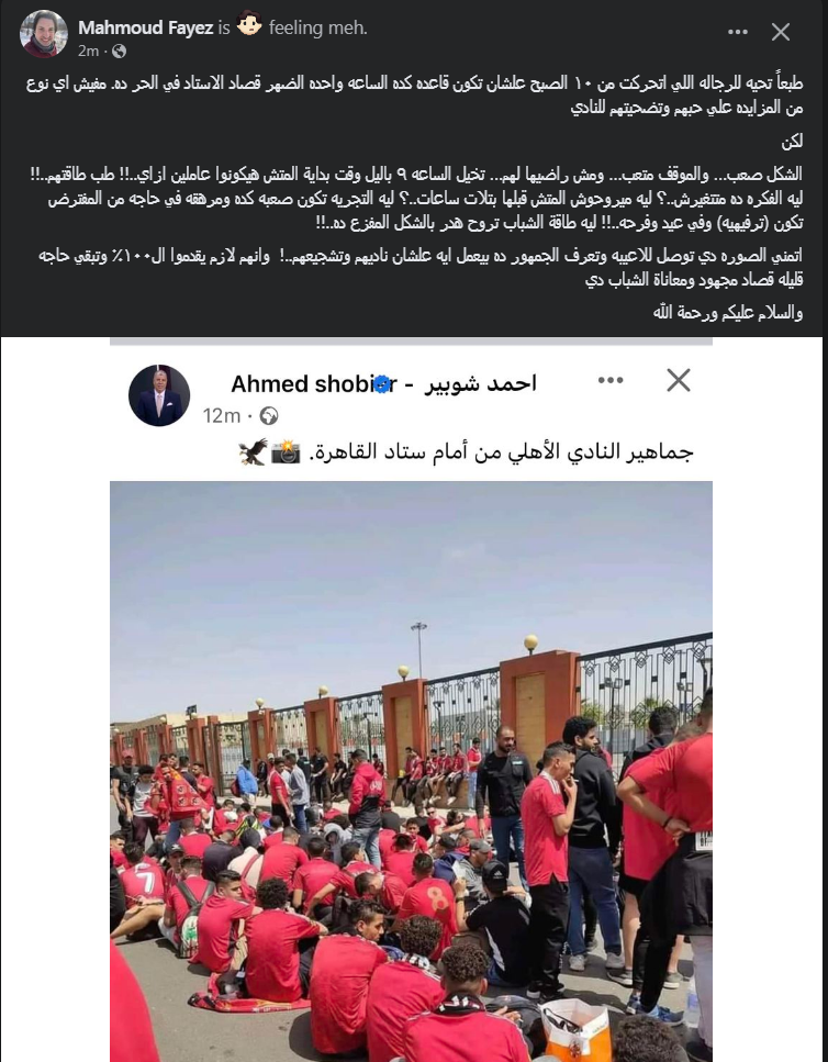 وكتب محمود فايز مساعد كولر المدير الفني السابق لمنتخب مصر عبر حسابه الرسمي"فيسوك":" طبعاً تحيه للرجالة اللي اتحركت من ١٠ الصبح علشان تكون قاعده كده الساعة واحده الضهر قصاد الاستاد في الحر ده.. مفيش اي نوع من المزايدة علي حبهم وتضحيتهم للنادي.