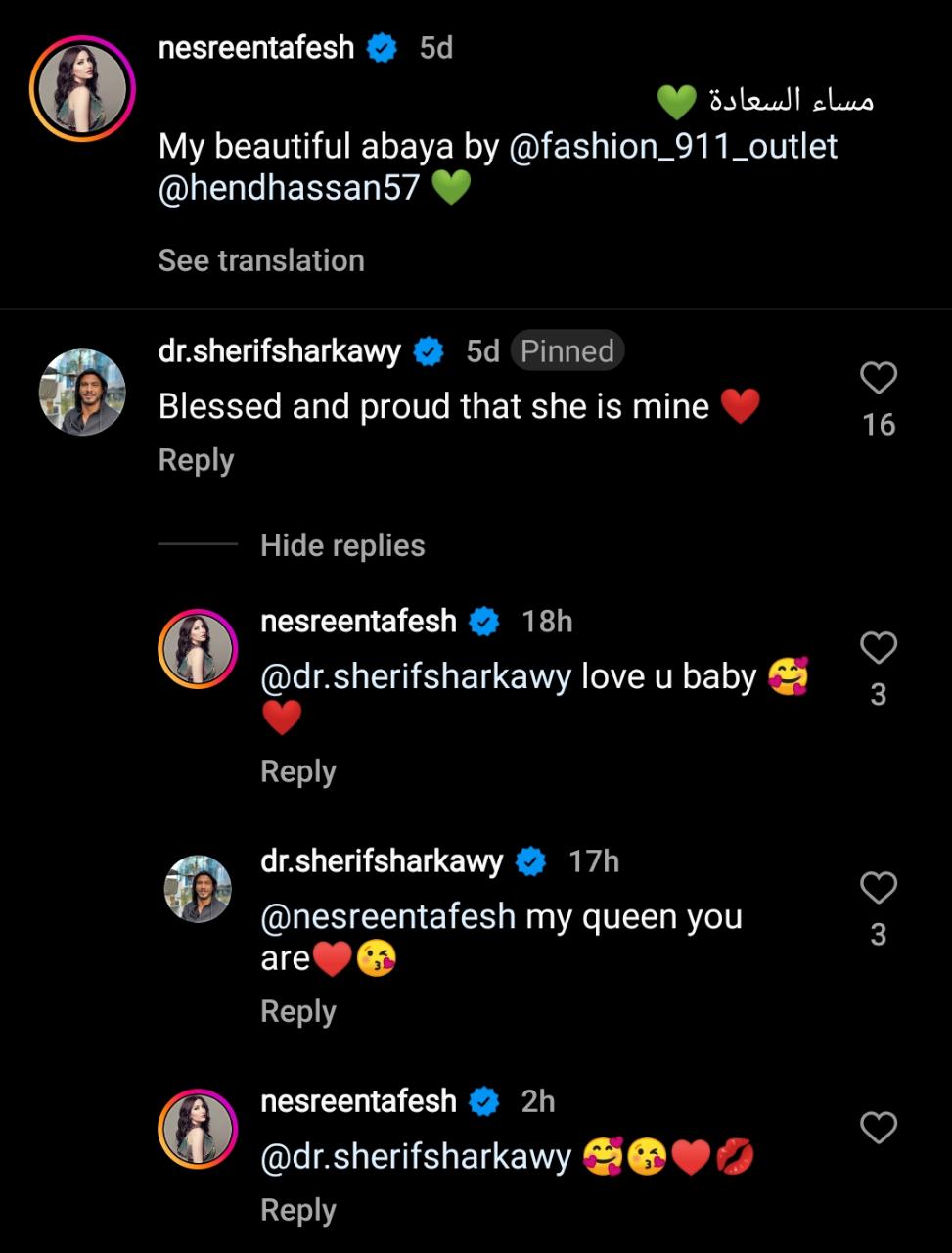 فمنذ 5 أيام علق شريف شرقاوي زوج نسرين طافش على أحد منشوراتها قائلًا: مباركة وفخورة لأنها لي، وردت عليه الأخيرة قائلة: أحبك حبيبي، مما يؤكد ذلك عودة العلاقات بينهما مرة أخرى.