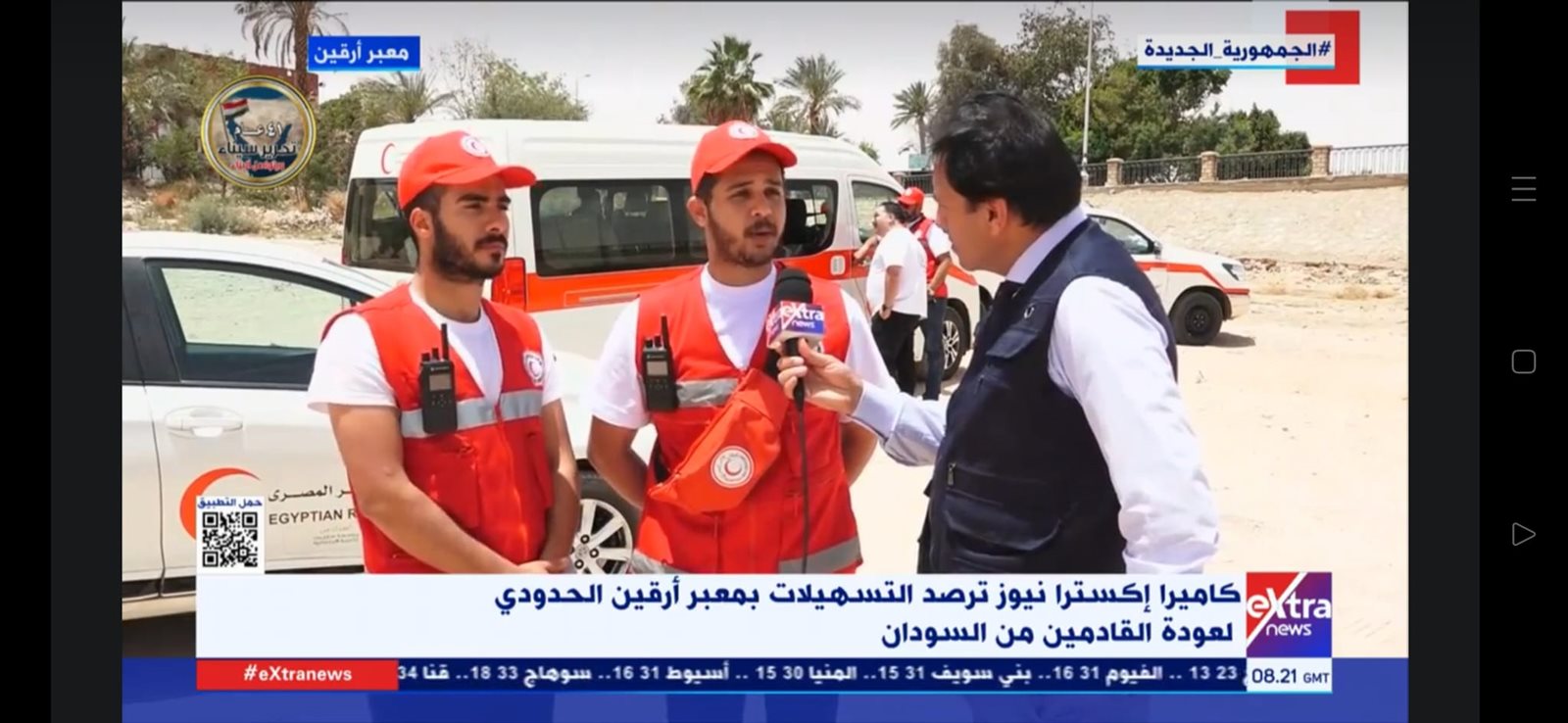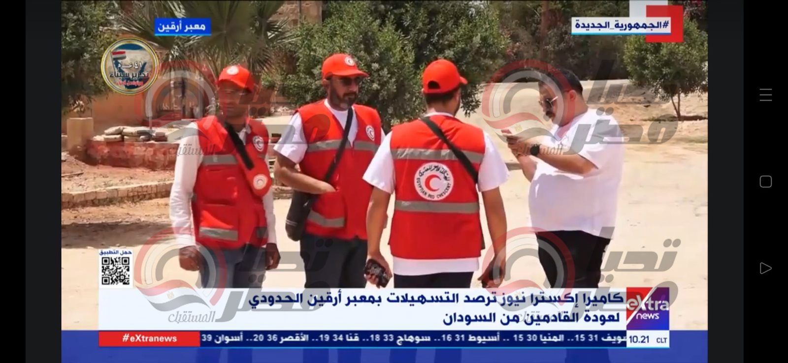 أجرت قناة ExtraNews، تغطية خاصة على الهواء مباشرة، لرصد التسهيلات والجهود المصرية بمعبر أرقين الحدودي، وذلك لعودة القادمين من السودان من خلال عدد كبير من المؤسسات المصرية، وفي مقدمتها جمعية "الهلال الأحمر".