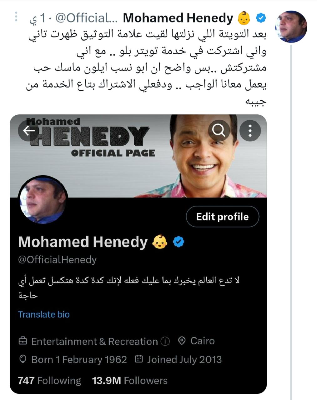 وبعد مرور عدة ساعات عادت العلامة الزرقاء مرة أخرى لحساب محمد هنيدي على تويتر، وعلق هنيدي على ذلك قائلًا: بعد التويتة اللي نزلتها لقيت علامة التوثيق ظهرت تاني واني اشتركت في خدمة تويتر بلو.. مع اني مشتركتش ..بس واضح ان ابو نسب ايلون ماسك حب يعمل معانا الواجب.. ودفعلي الاشتراك بتاع الخدمة من جيبه.