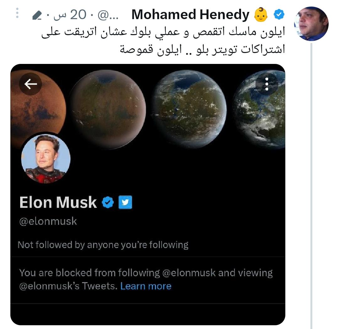 وبعدها تفاجئ الجميع بقيام أيلون ماسك بحظر محمد هنيدي عبر تويتر، وعلق هنيدي على ذلك في تويتة قائلًا: ايلون ماسك اتقمص وعملي بلوك عشان اتريقت على اشتراكات تويتر بلو .. ايلون قموصة.
