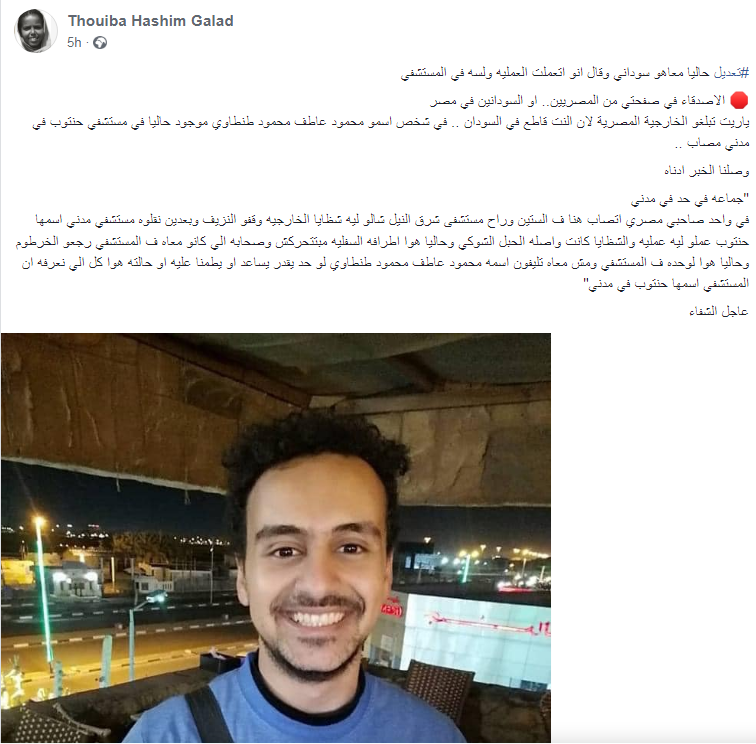 وذكرت الناشطة السودانية ثوبية هاشم، عبر حسابها على الفيسبوك:" نداء من أصدقاء الطالب المصري محمود عاطف محمود طنطاوي يفيد بتعرضه لإصابات خطيرة أثناء وجوده فى شارع الستين شرق العاصمة السودانية بالخرطوم".