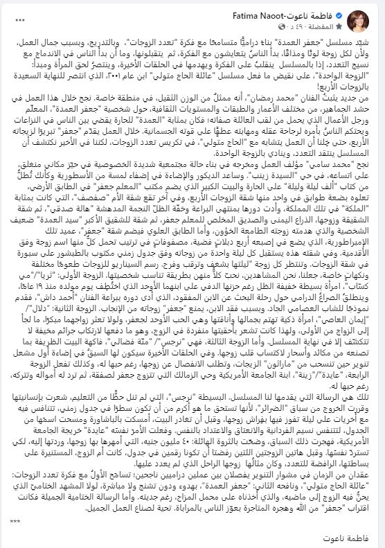 وأكدت فاطمة ناعوت، أن عقدان من الزمان في مشوار التنوير يفصلان بين عملين دراميين ناجحين؛ تسامَح الأولُ مع فكرة تعدد الزوجات: «عائلة الحاج متولي»، ونافحه الثاني: «جعفر العمدة»، بهدوء ودون تشنج ولا مباشرة، لولا المشهد الختاميّ الذي يحنُّ فيه الزوج إلى ماضيه، والذي أخذناه على محمل المزاح، رغم جديته، وأما الرسالة الختامية الجميلة فكانت اقتراب «جعفر» من الله وهجره المتاجرة بعوّز الناس بالمراباة، تحية لصناع العمل الجميل.