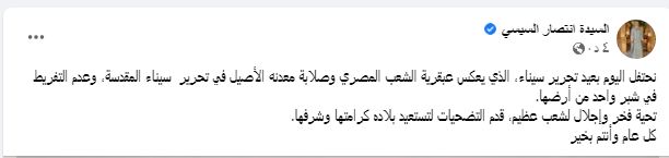 وقالت "السيسي"، في منشور لها، على صفحتها على فيس بوك: "نحتفل اليوم بعيد تحرير سيناء، الذي يعكس عبقرية الشعب المصري وصلابة معدنه الأصيل في تحرير سيناء المقدسة، وعدم التفريط في شبر واحد من أرضها".