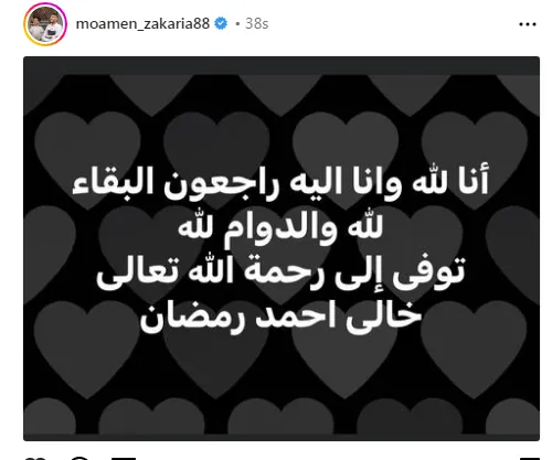 ونشر مؤمن، استوري عبر حسابه الرسمي بموقع “ إنستجرام”، وقال: “ إنا لله وإنا إليه راجعون، البقاء والدوام لله.. توفى إلى رحمة الله تعالى خالي أحمد رمضان”.