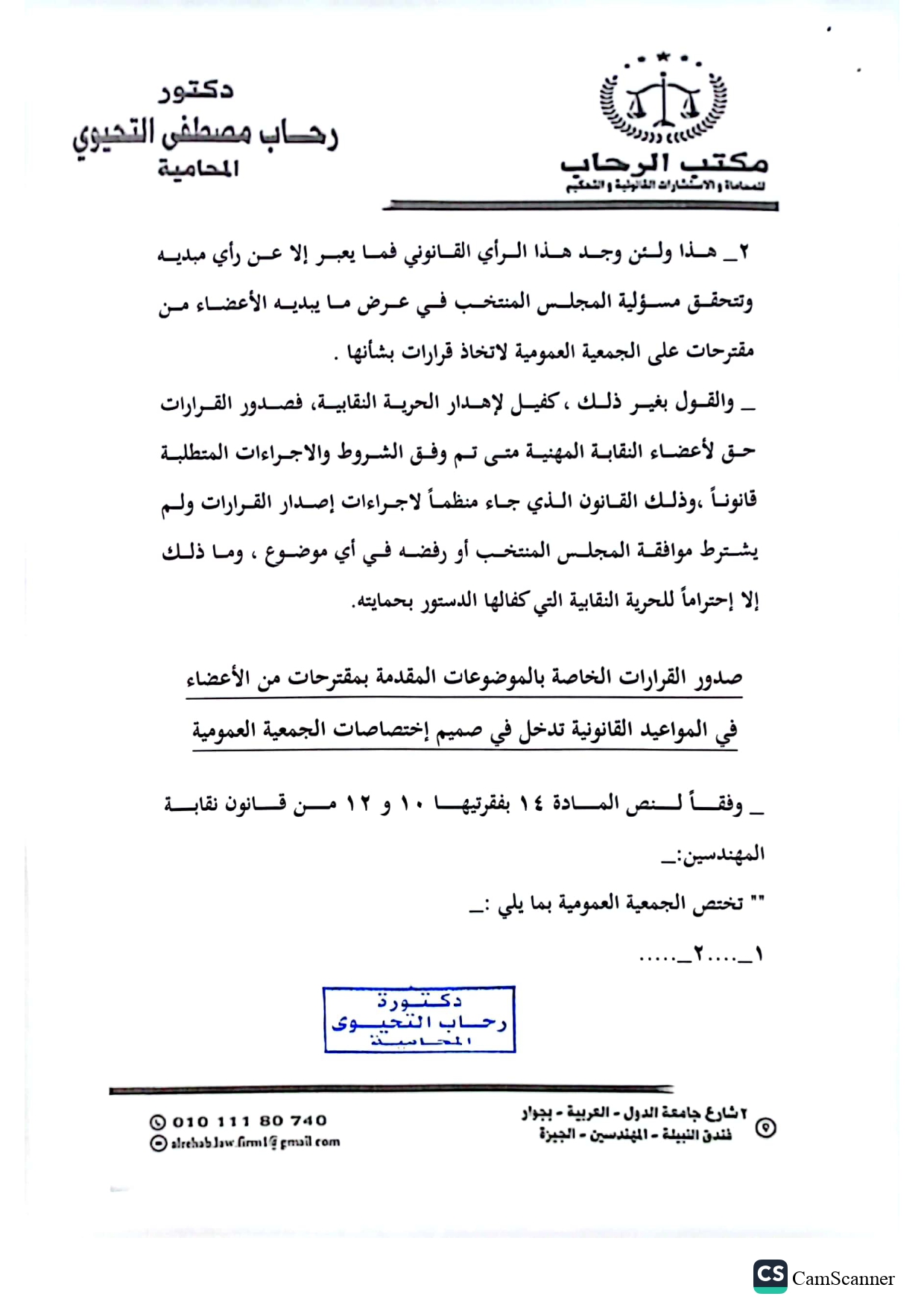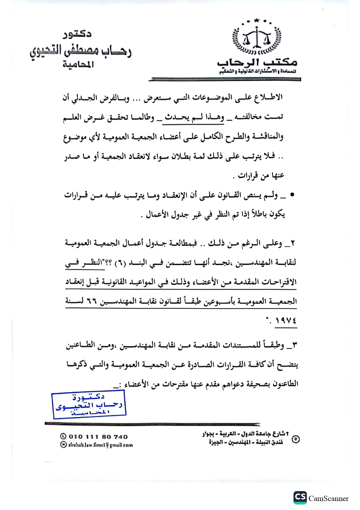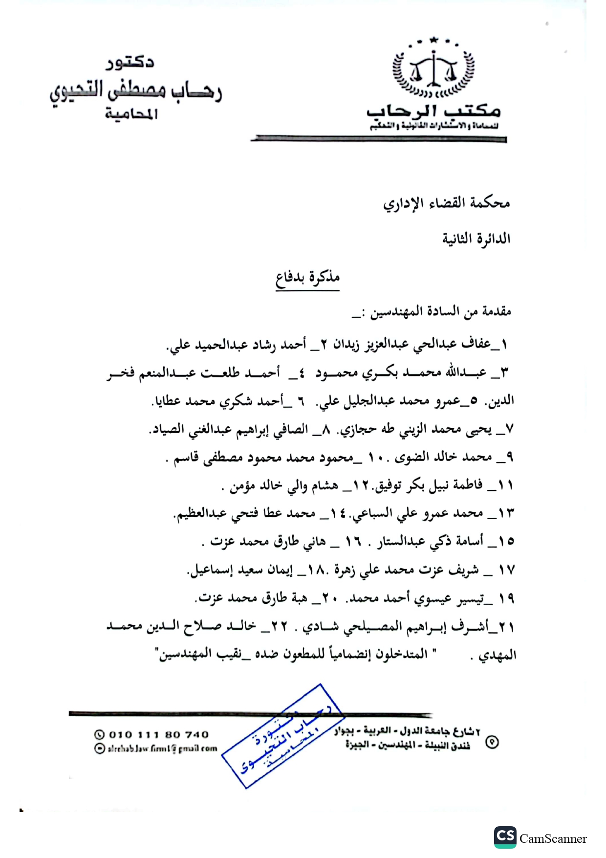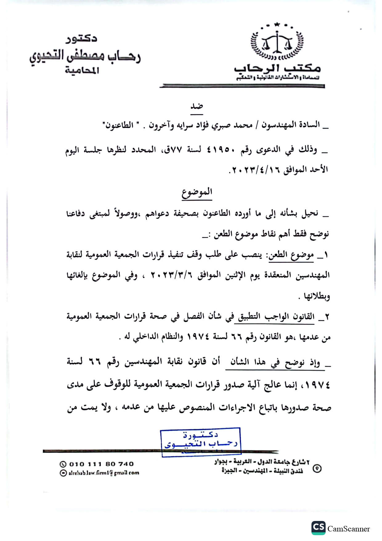 تحيا مصر ينشر مذكرة دفاع نقابة المهندسين عن قرارات الجمعية العمومية..والتحيوى تؤكد:نحترم أحكام القضاء «مستند»