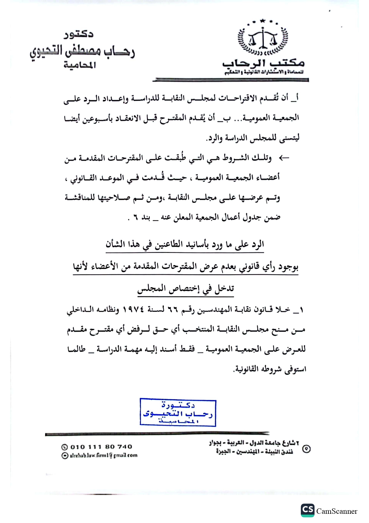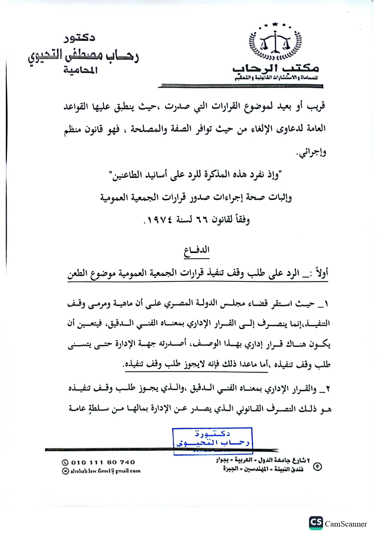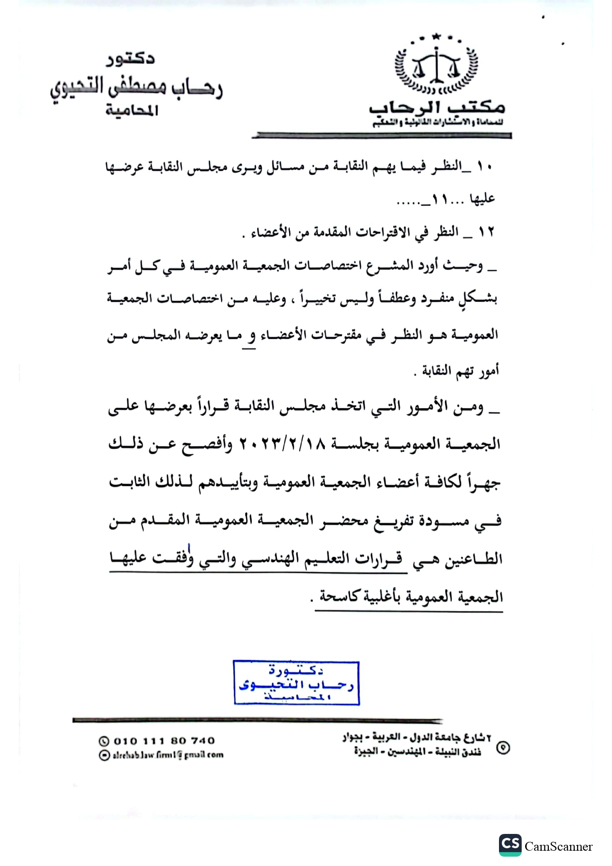 تحيا مصر ينشر مذكرة دفاع نقابة المهندسين عن قرارات الجمعية العمومية..والتحيوى تؤكد:نحترم أحكام القضاء «مستند»