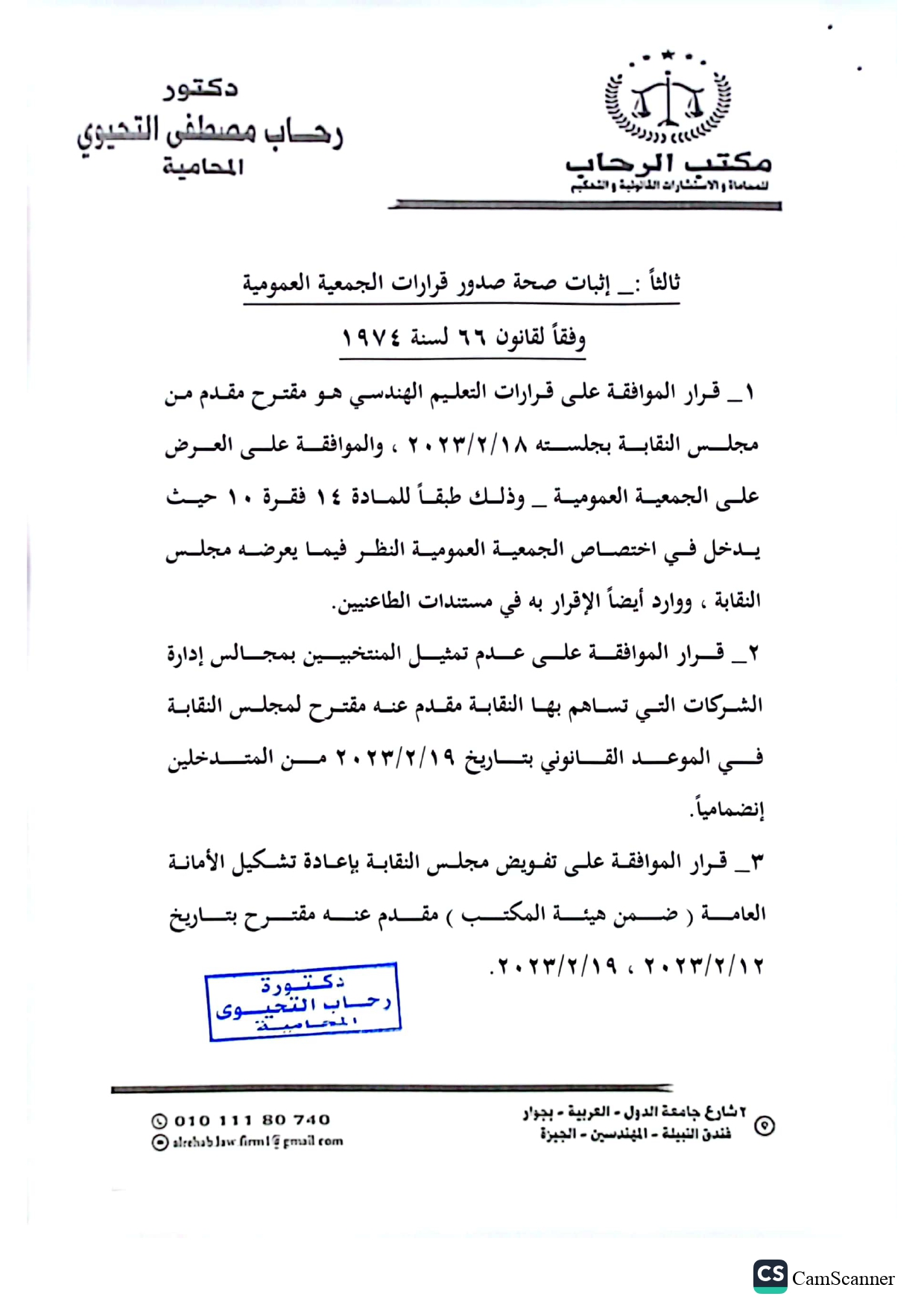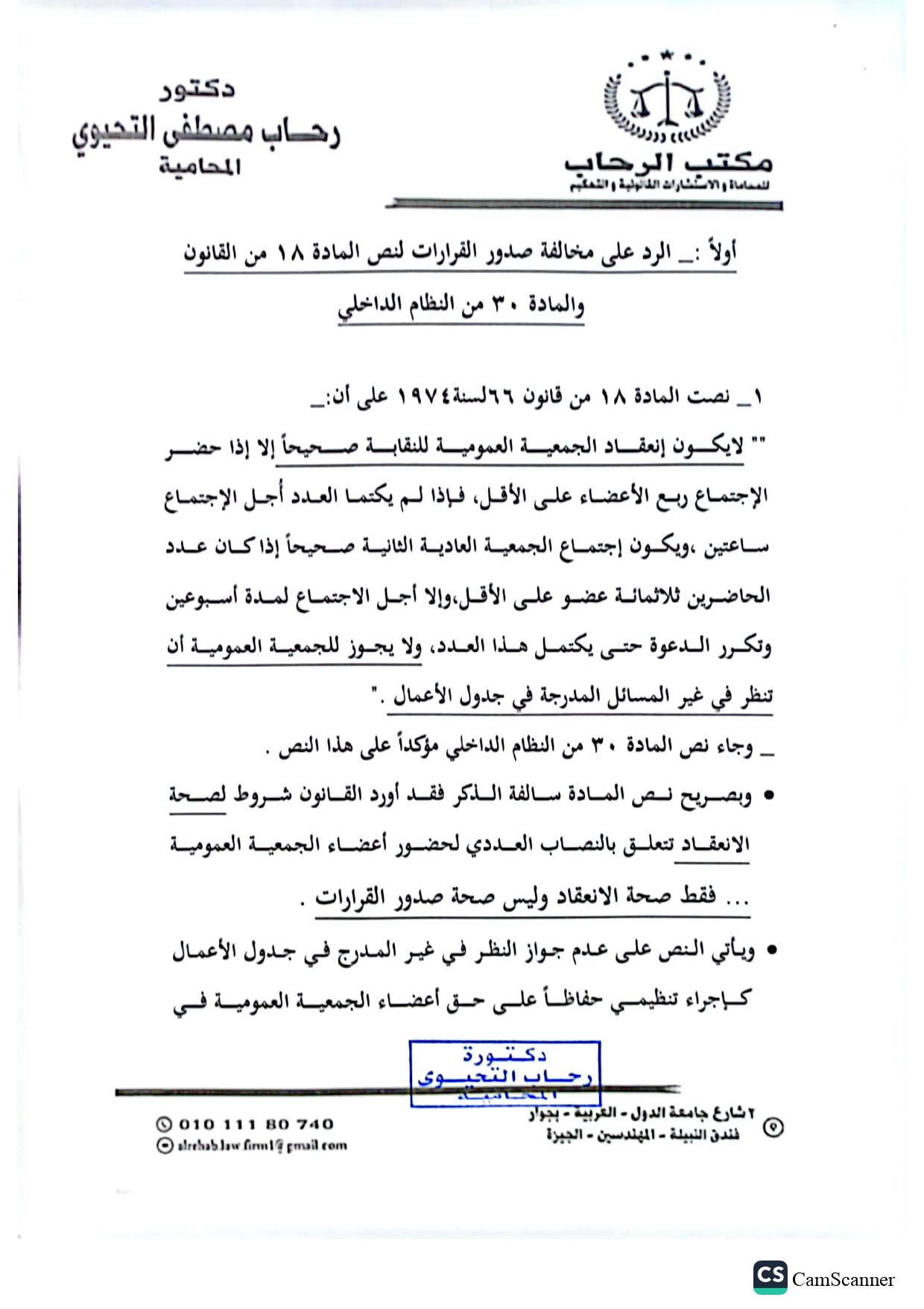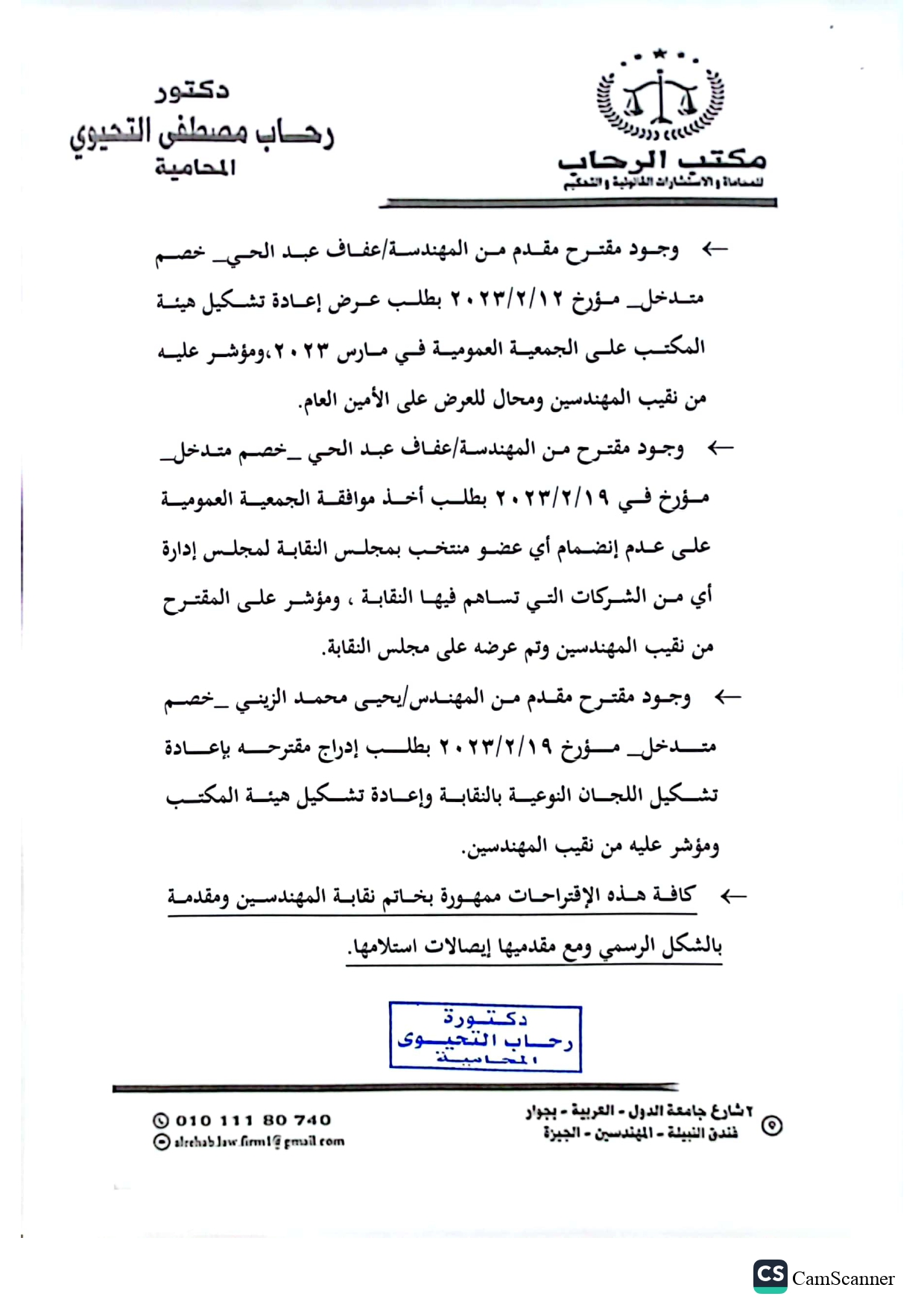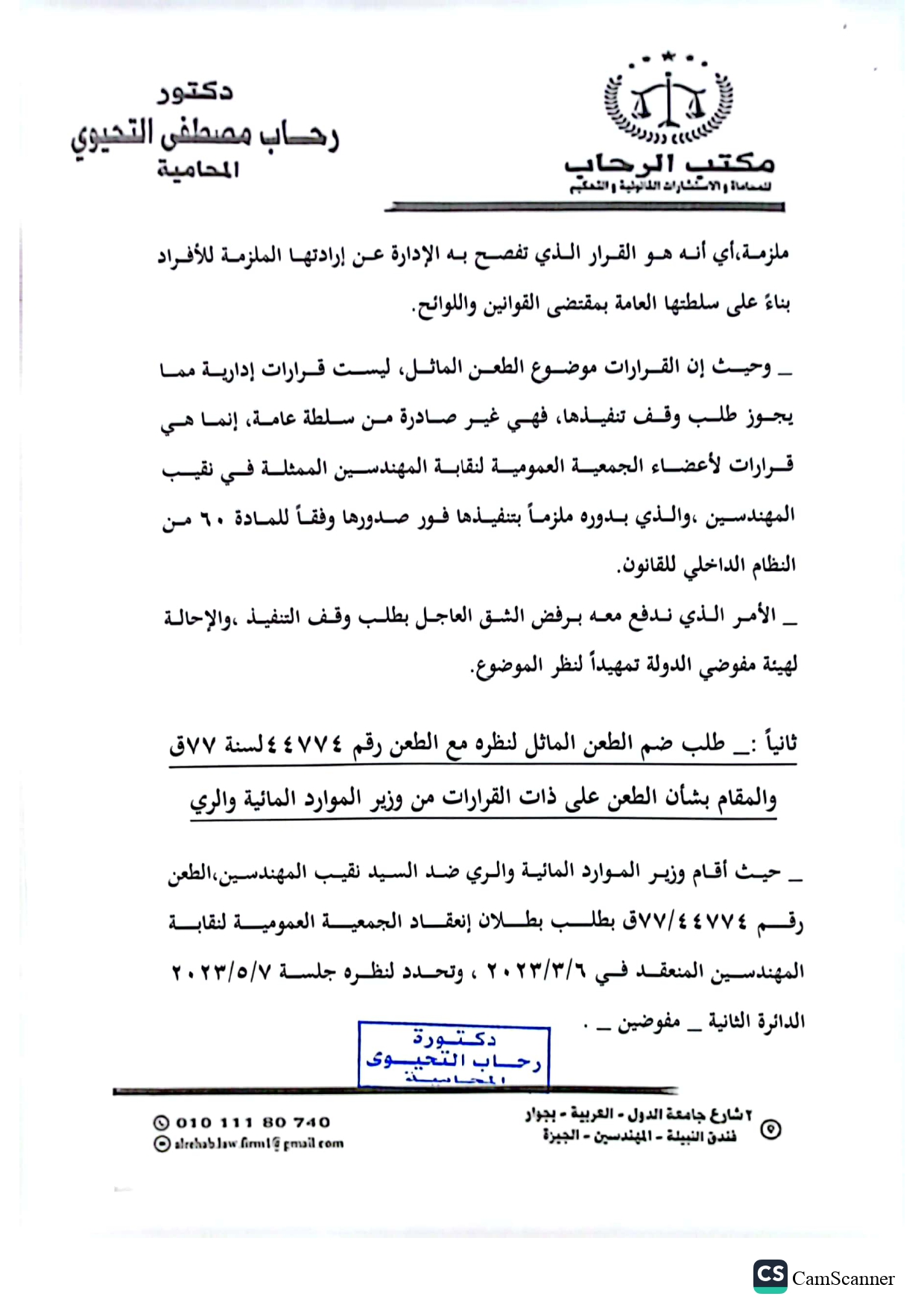 تحيا مصر ينشر مذكرة دفاع نقابة المهندسين عن قرارات الجمعية العمومية..والتحيوى تؤكد:نحترم أحكام القضاء «مستند»