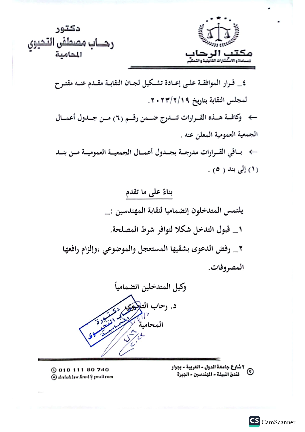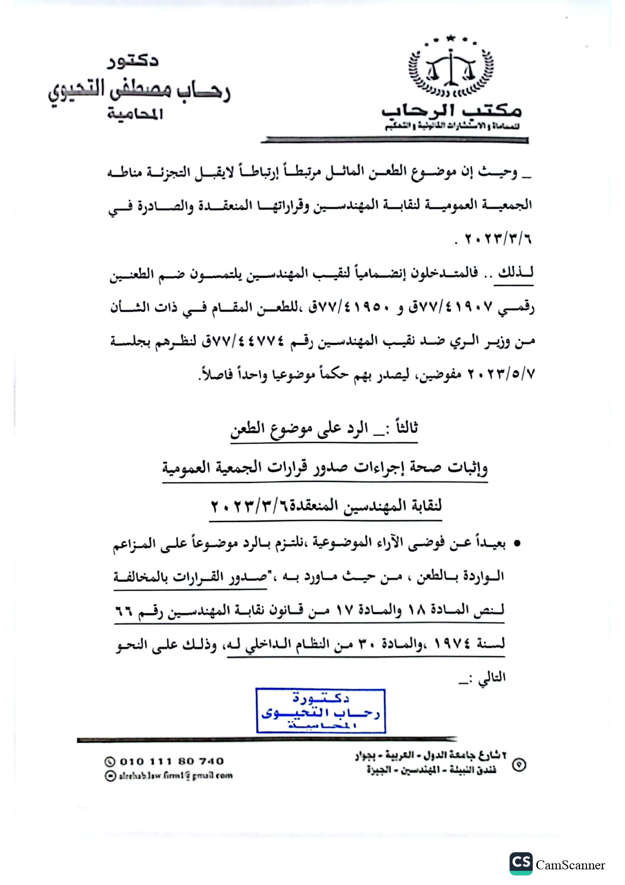 وحصل موقع تحيا مصر نص مذكرة دفاع المحامية الدكتور رحاب التحيوى، وهى محامية عن 22 مهندس متداخلين إنضماميًا لنقابة المهندسين، ردًا على الطعون المقدمة على قرارات الجمعية والتى أكدت لـ تحيا مصر بأن صفت موكليها في الطعن خصوم متدخلين انضماميا لنقيب المهندسين وتتوافر بحق المتدخلين الصفة والمصلحة بصفتهم أعضاء جمعية عمومية بنقابة المهندسين.