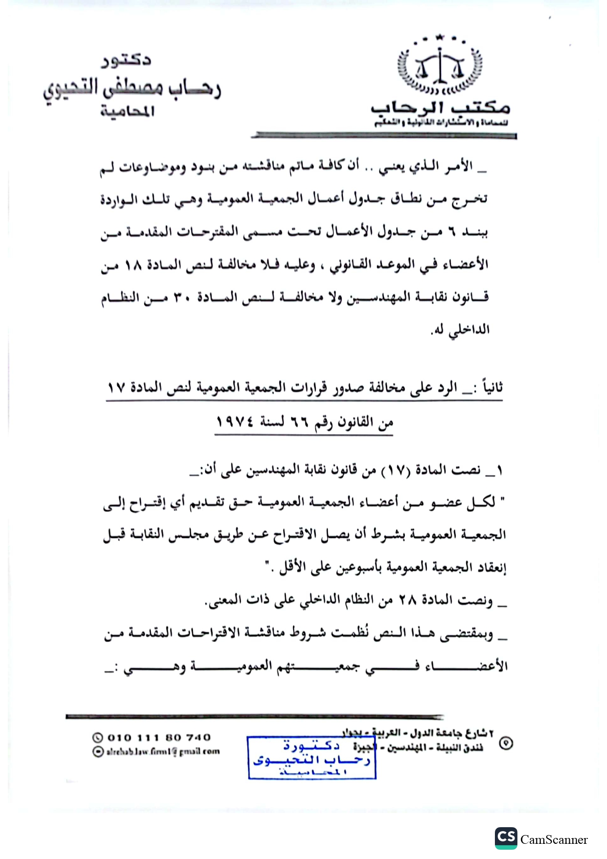 ولفتت إلى أنه في كل الأحوال يحترم الجميع أحكام القضاء ويثقوا فيما يصدره، وكل مُبتغى أعضاء الجمعية العمومية هو الشرعية وعدم الافتئات على إرادتهم، متابعة:"متى صدر حكم ببطلان قرارات الجمعية العمومية لنقابة المهندسين، فلا غضاضة في ذلك ... وسيكون إلتزاما على النقابة بالدعوة لاجتماع الجمعية العمومية مرة أخرى في مدى ثلاثين يوما من تاريخ الحكم ... وذلك إلتزام وجوبي بنص المادة ٢١ من قانون نقابة المهندسين.
