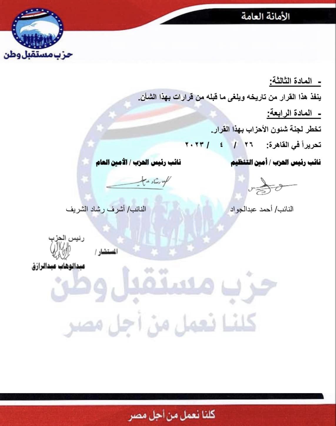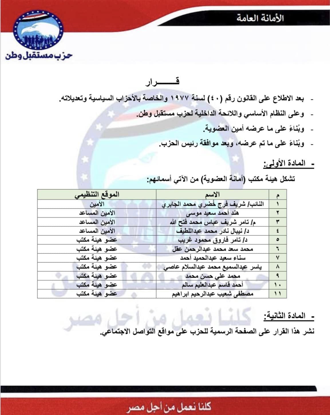حزب مستقبل وطن يعلن تشكيل هيئة مكتب أمانة العضوية المركزية