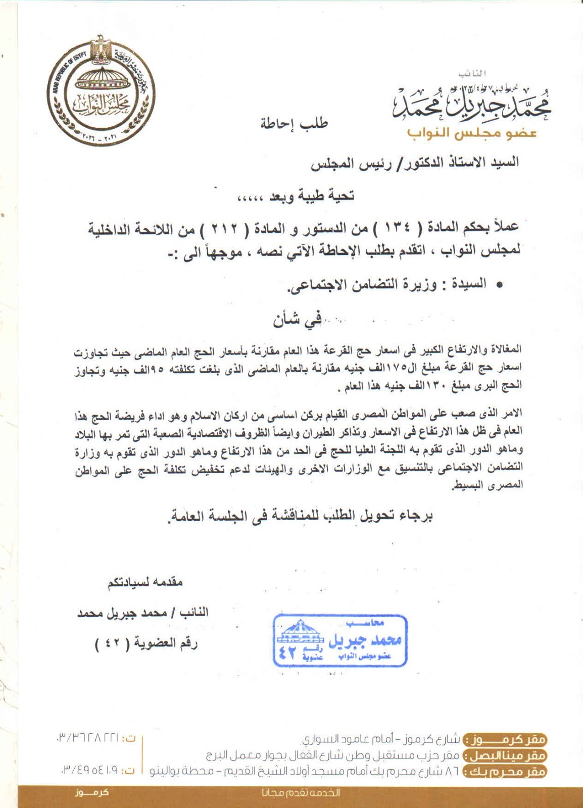 تقدم النائب محمد جبريل محمد، عضو مجلس النواب، بطلب إحاطة للمستشار الدكتور حنفي جبالي، موجه لوزيرة التضامن الاجتماعي، بشأن المغالاة والارتفاع الكبير في أسعار حج القرعة هذا العام، مقارنة بأسعار الحج العام الماضي.