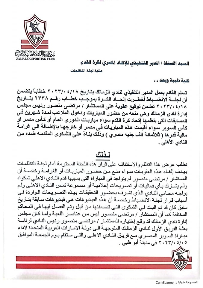وجاءت مذكرة مجلس إدارة الزمالك بشأن المشاركة في مباراة السوبر كالتالي:-