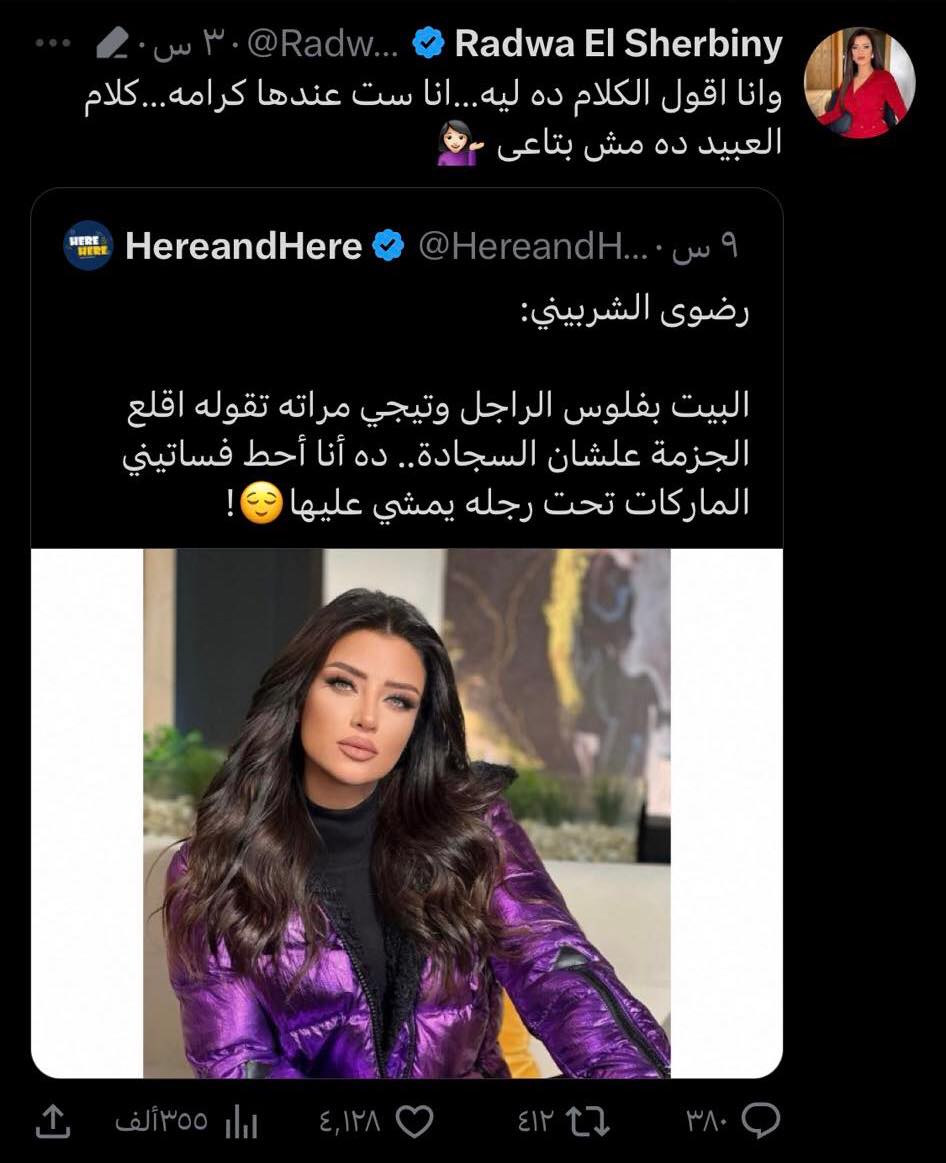 وأعادت رضوى الشربيني نشر صورة لأحد الحسابات على موقع التدوينات القصيرة تويتر إدعى أنها قالت: "البيت بفلوس الراجل وتيجي مراته تقوله اقلع الجزمة علشان السجادة.. ده أنا أحط فساتيني الماركات تحت رجله يمشي عليها"، وهذا أحد تصريحات ياسمين عز المثيرة للجدل الشهيرة، وكتبت: "وانا اقول الكلام ده ليه…انا ست عندها كرامه…كلام العبيد ده مش بتاعي".