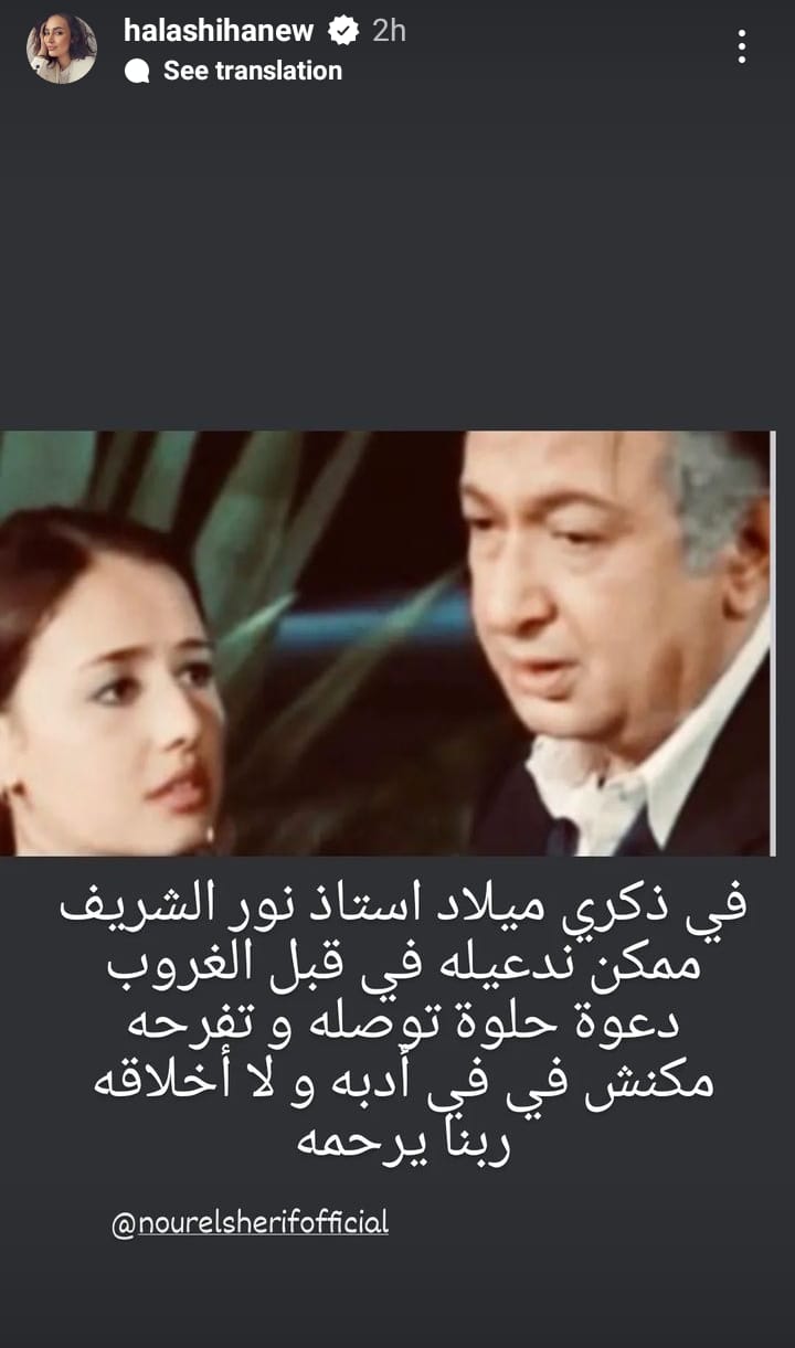 ونشرت حلا شيحة صورة تجمعها بـ نور الشريف عبر حسابها الرسمي بموقع تبادل الصور والفيديوهات انستجرام، من خلال خاصية “ستوري”، وعلقت عليها: “في ذكرى ميلاد الأستاذ نور الشريف ممكن ندعيله قبل الغروب، دعوة حلوة توصله وتفرحه، مكنش فيه في ولا أخلاقه ربنا يرحمه".