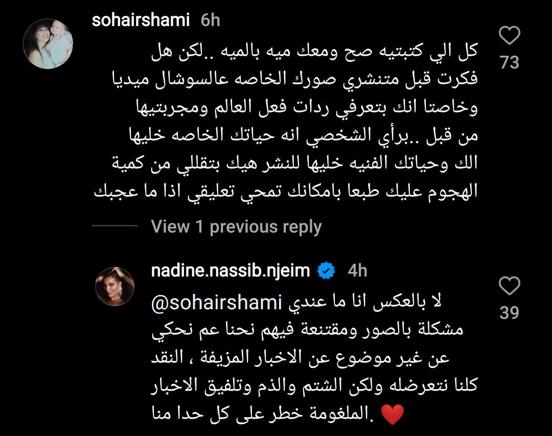 وفيه ردت نادين نجيم على تعليق أحد المتابعين ذكر الهجوم الذي تعرضت له بسبب صورها الجريئة مع خطيبها في المالديف، وقالت: لا بالعكس ما عندي مشكلة بالصور ومقتنعة فيهم نحنا عن نحكي عن غير موضوع، عن الأخبار الزائفة، النقد كلنا نتعرضله ولكن الشتم والذم وتلفيق الأخبار المغلوطة خطر على كل حدا منا.