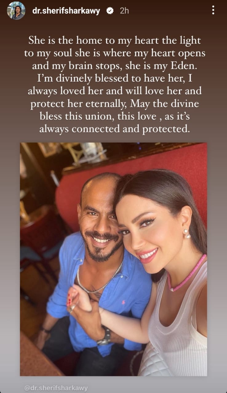 ونشر صورة تجمعه بنسرين طافش خلال خاصية إستوري، وعلق عليها قائلًا: إنها موطن قلبي، الضوء الذي يبعث على روحي، هي المكان الذي ينفتح فيه قلبي ويتوقف دماغي، إنها عدني، أنا محظوظ حقًا أن أملكها، أحبها دائمًا وسأحبها وأحميها دائمًا، قد يبارك الله هذا الاتحاد، هذا الحب كما هو متصلاً ومحميًا دائمًا.