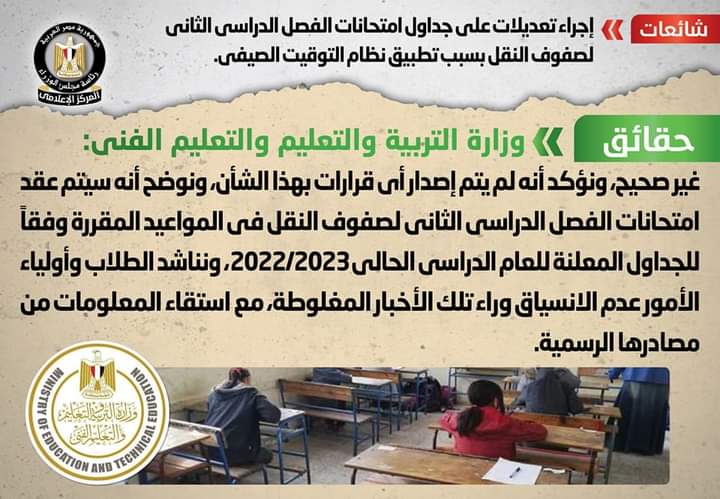 وقد قام المركز الإعلامي لمجلس الوزراء بالتواصل مع وزارة التربية والتعليم والتعليم الفني، والتي نفت تلك الأنباء، مُؤكدةً أنه لا صحة لإجراء تعديلات على جداول امتحانات الفصل الدراسي الثاني لصفوف النقل بسبب تطبيق نظام التوقيت الصيفي، وأنه لم يتم إصدار أي قرارات بهذا الشأن، مُوضحةً أنه سيتم عقد امتحانات الفصل الدراسي الثاني لصفوف النقل في المواعيد المقررة، وفقاً للجداول المعلنة للعام الدراسي الحالي 2022/2023، مُناشدةً الطلاب وأولياء الأمور عدم الانسياق وراء تلك الأخبار المغلوطة، مع استقاء المعلومات من مصادرها الرسمية.