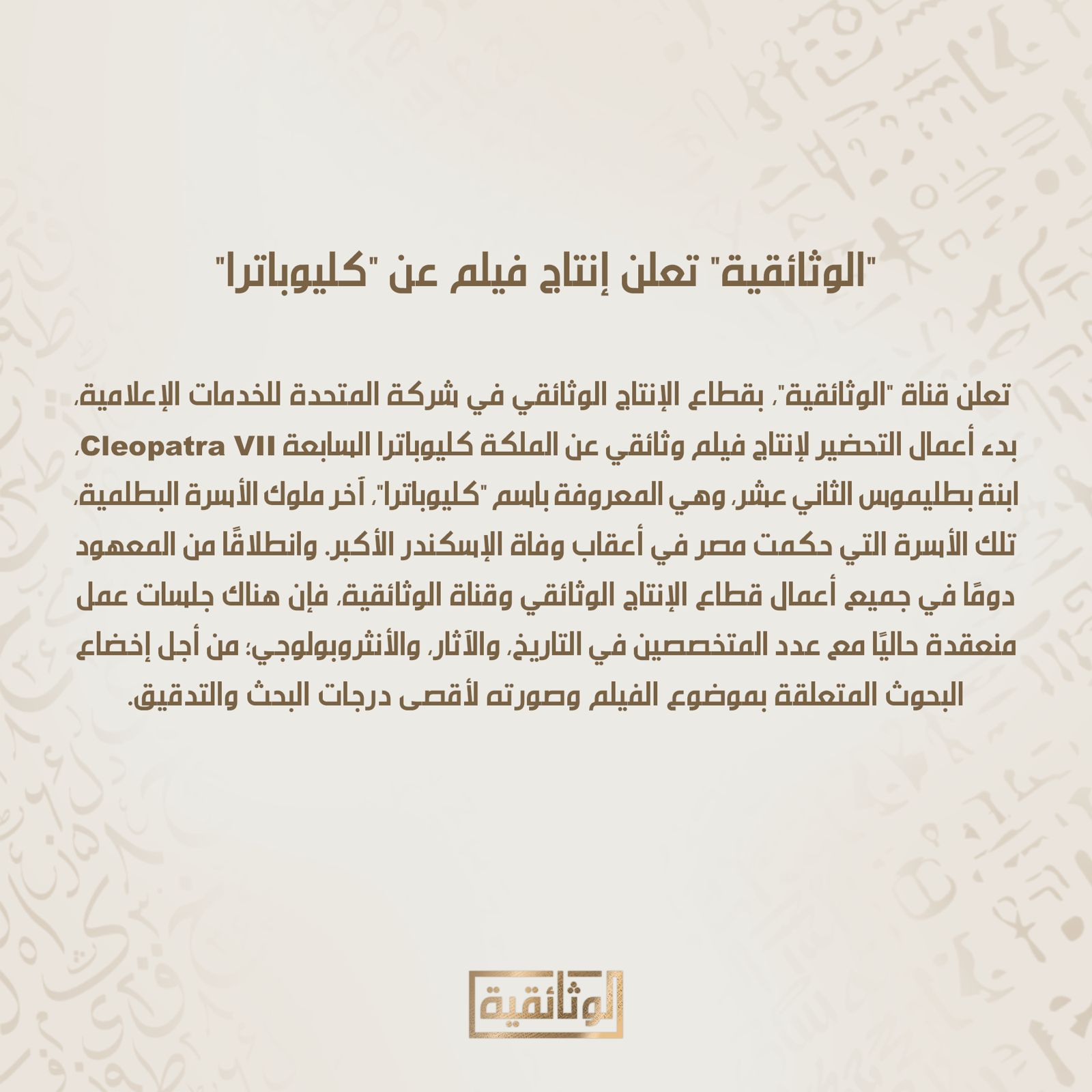 سادت توقعات واسعة بأنه انطلاقًا من الجهد المعهود دومًا في جميع أعمال قطاع الإنتاج الوثائقي وقناة الوثائقية، سوف يكون الفيلم المنتج من قبلها عن الملكة "كليوباترا"، أبلغ رد على المدعيين والراغبين في تشويه الحضارة المصرية، لذا فقد انطلقت جلسات عمل منعقدة حاليًا مع عدد المتخصصين في التاريخ، والآثار، والأنثروبولوجي من أجل إخضاع البحوث المتعلقة بموضوع الفيلم وصورته لأقصى درجات البحث والتدقيق.
