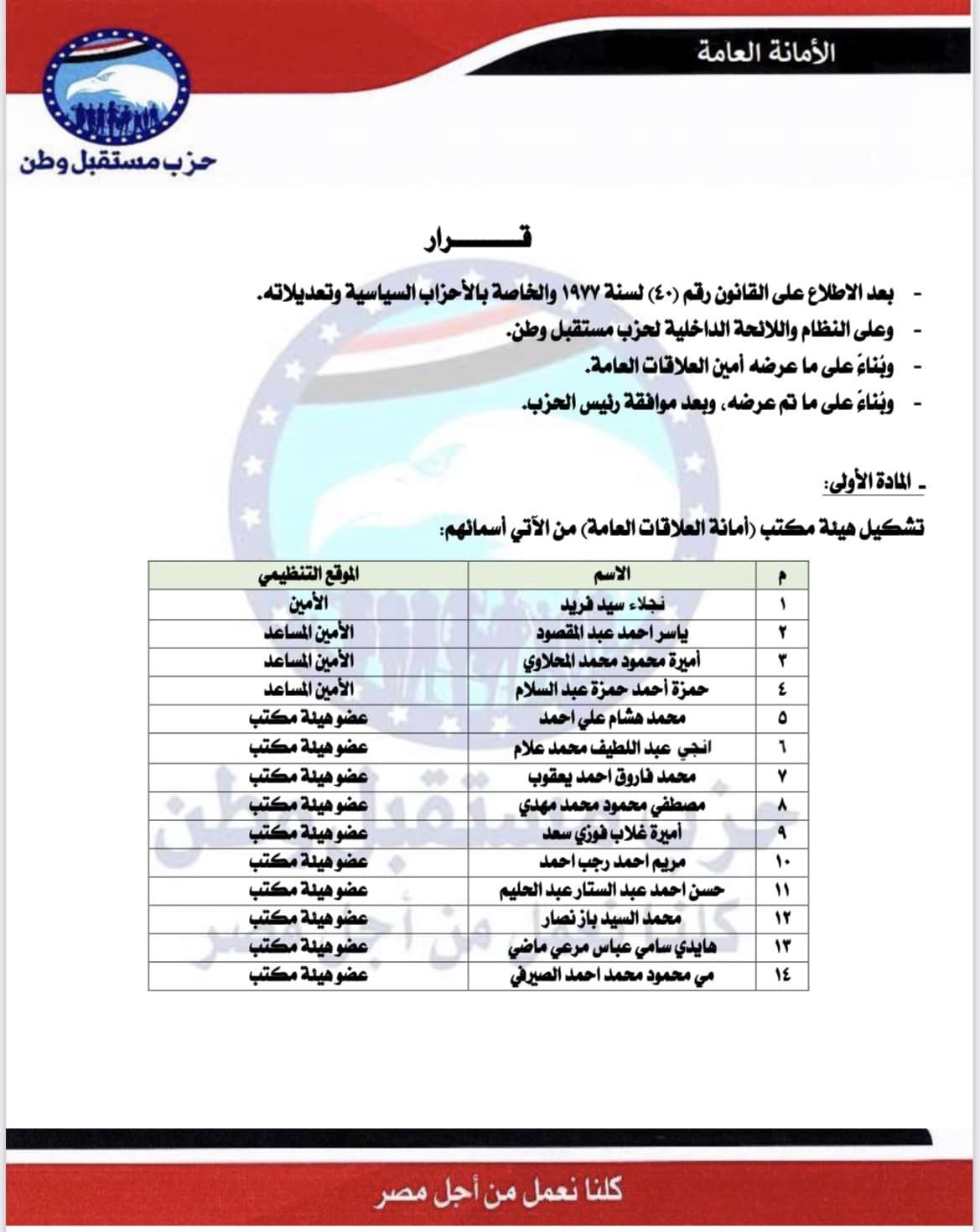 أعلن حزب مستقبل وطن، تشكيل هيئة مكتب أمانة العلاقات العامة المركزي للحزب والتي جاءت بقيادة نجلاء سيد فريد.