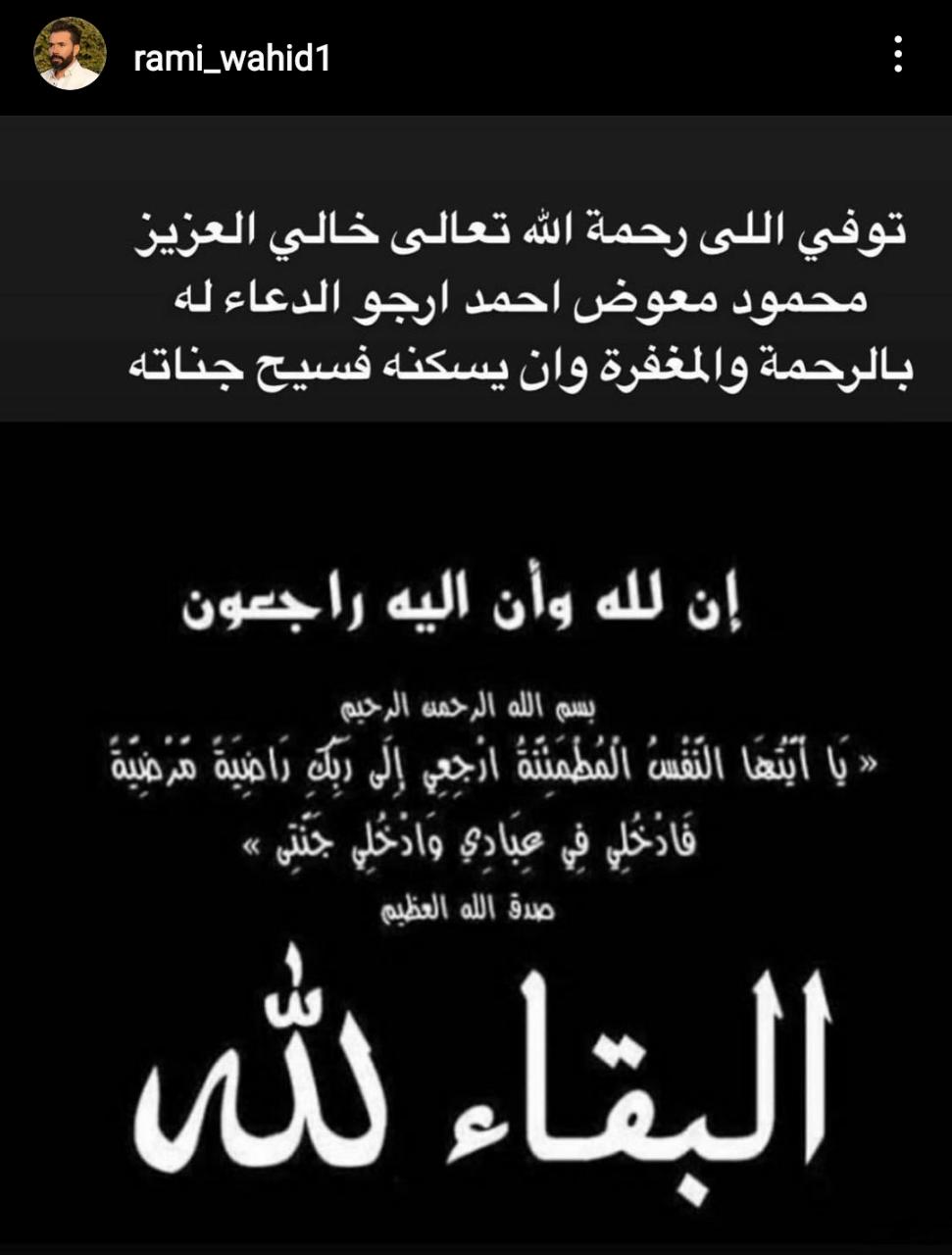 حيث كتب رامي وحيد: توفى إلى رحمة الله تعالى خالي العزيز محمود معوض أحمد، أرجو الدعاء له بالرحمة والمغفرة وأن يسكنه فسيح جناته.