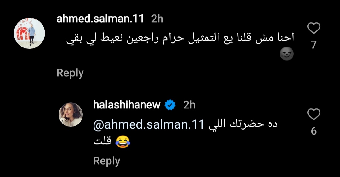 حيث انتقد متابع حلا شيحة قائلًا: "احنا مش قولنا يع التمثيل حرام راجعين نعيط ليه بقى"، لترد عليه الفنانة قائلة: “دا حضرتك اللي قولت”.