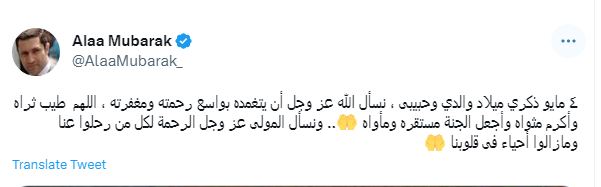 وأحيى علاء مبارك ذكرى ميلاده والده، من خلال تويتة على موقع التدوينات القصيرة "تويتر": "4 مايو ذكري ميلاد والدي وحبيبى ، نسأل الله عز وجل أن يتغمده بواسع رحمته ومغفرته ، اللهم طيب ثراه وأكرم مثواه وأجعل الجنة مستقره ومأواه.. ونسأل المولى عز وجل الرحمة لكل من رحلوا عنا ومازالوا أحياء فى قلوبنا".