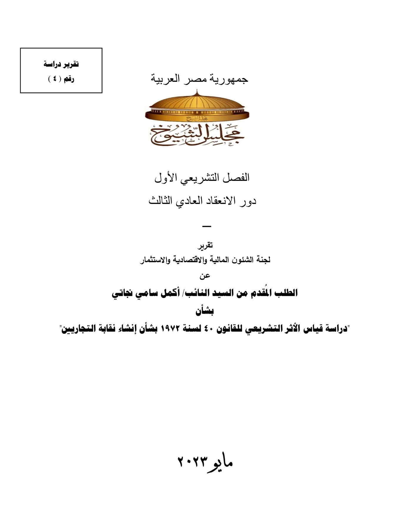 تحيا مصر ينشر تقرير لجنة الشئون المالية والاقتصادية والاستثمار بمجلس الشيوخ عن الطلب المقدم من النائب أكمل نجاتي عضو تنسيقية شباب الأحزاب والسياسيين، بشأن دراسة الأثر التشريعي للقانون رقم 40 لسنة 1972 بشأن إنشاء نقابة التجاريين.