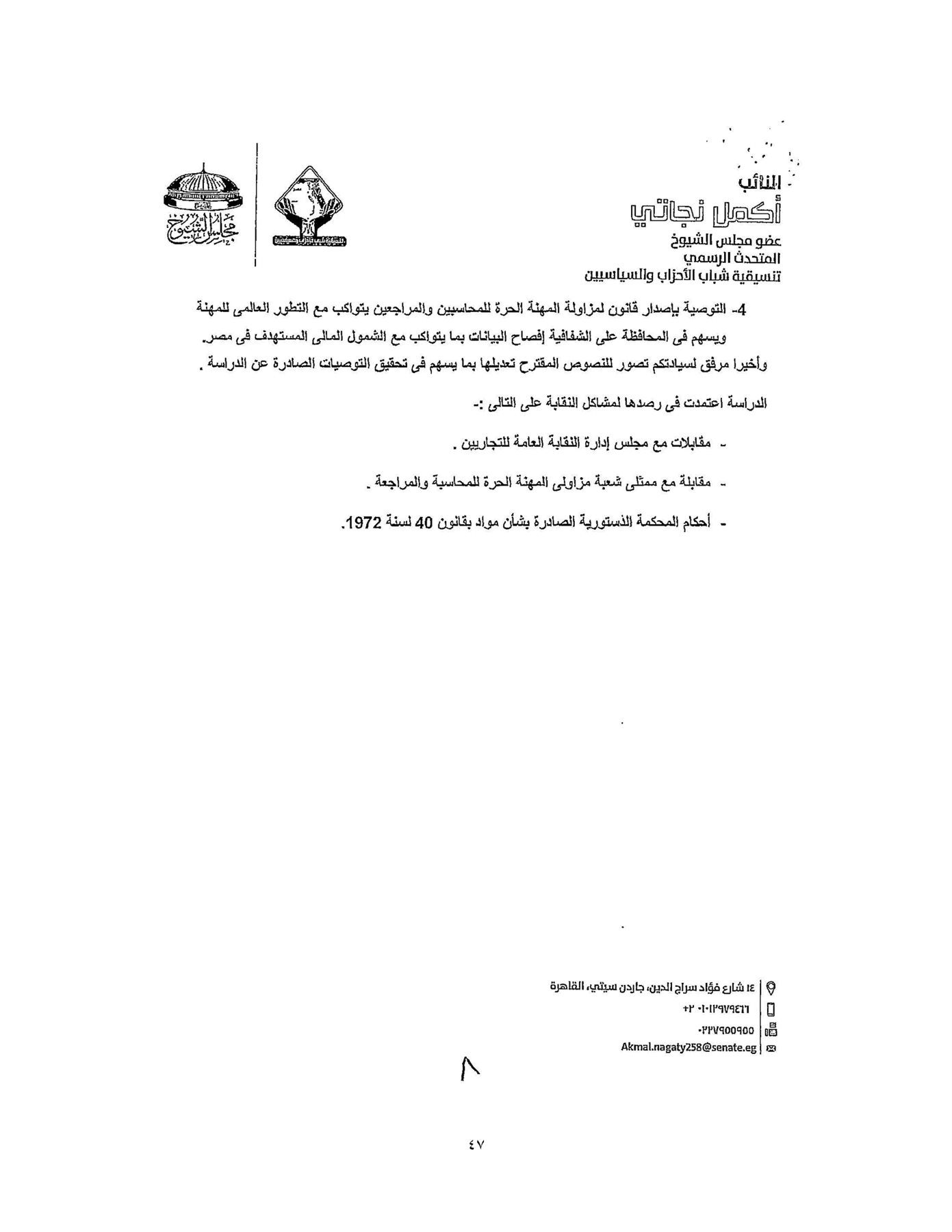 تحيا مصر ينشر تقرير الشيوخ بشأن اقتراح نائب التنسيقية أكمل نجاتى للأثر التشريعى لقانون نقابة التجاريين..«مستند»