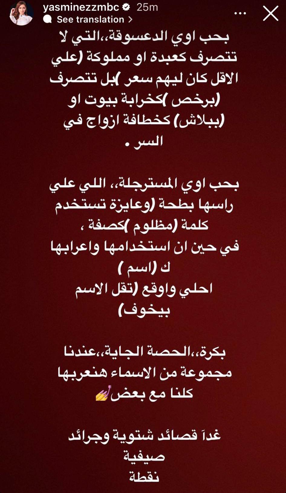 وكتبت ياسمين عز في ستوري: بحب أوي الدعسوقة، التي لا تتصرف كـ عبدة أو مملوكة، على الأقل كان ليهم سعر في سوق عكاظ، بل تتصرف برخص كـ خرابة بيوت أو ببلاش كـ خطافة أزواج في السن.