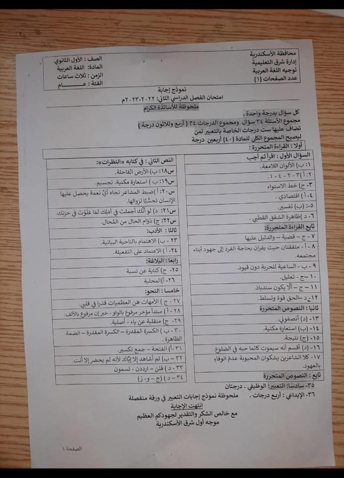 وتداولت صور من نموذج إجابة امتحان العربي أولي ثانوي 2023 محافظة الإسكندرية فى الصور التالية :