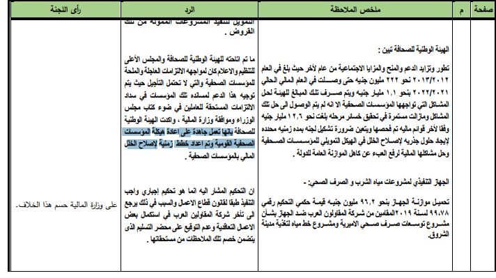 الحكومة ردت بشأن هذه الملاحظة وفقا للتقرير بأن ما تم اتاحته للهيئة الوطنية للصحافة والمجلس الأعلى للتنظيم والاعلام كان لمواجهة الالتزامات العاجلة والملحة للمؤسسات الصحفية والتي لا تحتمل التأجيل حيث يتم توجيه هذا الدعم لمسانده تلك المؤسسات في سداد الالتزامات المستحقة للعاملين في ضوء كتاب مجلس الوزراء وموافقة وزارة المالية ، واكدت الهيئة الوطنية للصحافة بأنها تعمل جاهدة على إعادة هيكلة المؤسسات الصحفية القومية وتم اعداد خطط زمنية لإصلاح الخلل المالي بالمؤسسات الصحفية .