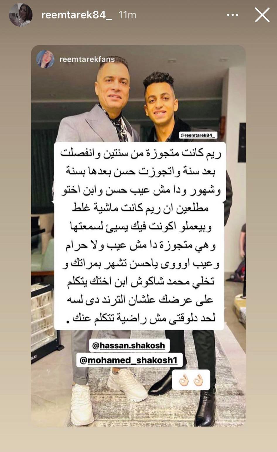 واعادت ريم نشر ستوري عبر حسابها بموقع تبادل الصور والفيديوهات انستجرام وجاءت فيها: ريم كانت متجوزة من سنتين وانفصلت بعد سنة واتجوزت حسن بعدها بسنة وشهور ودا مش عيب.