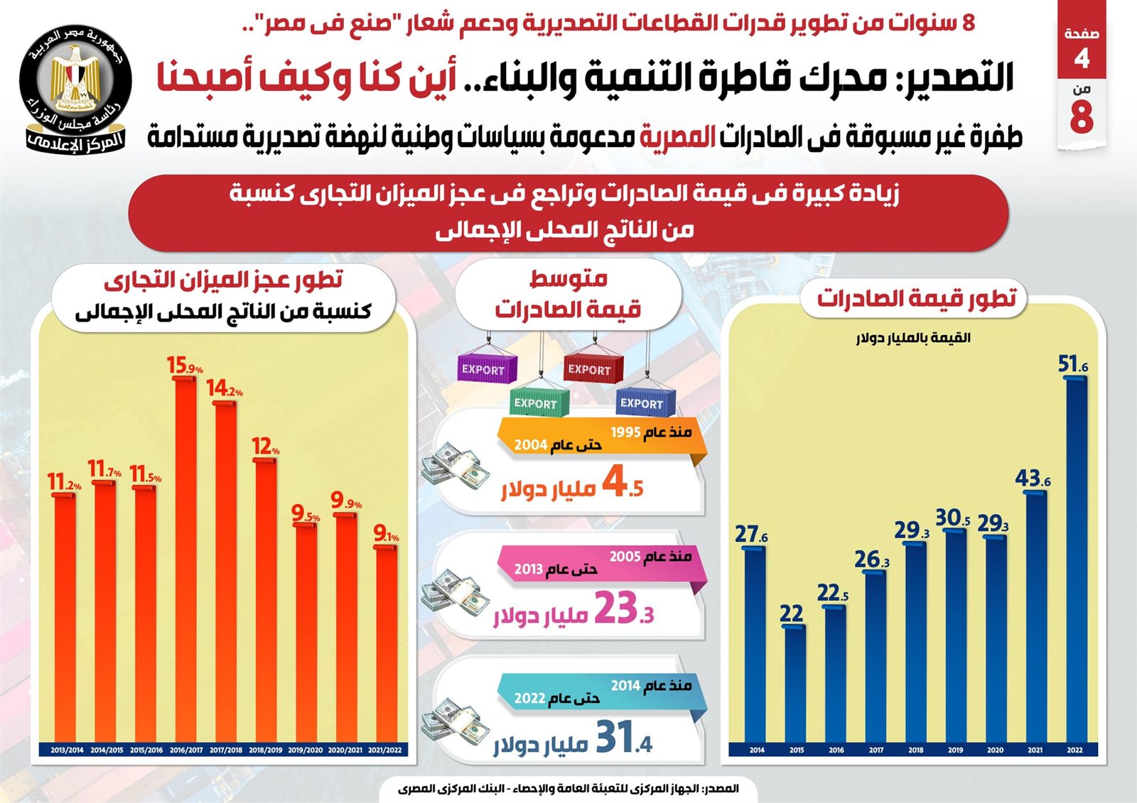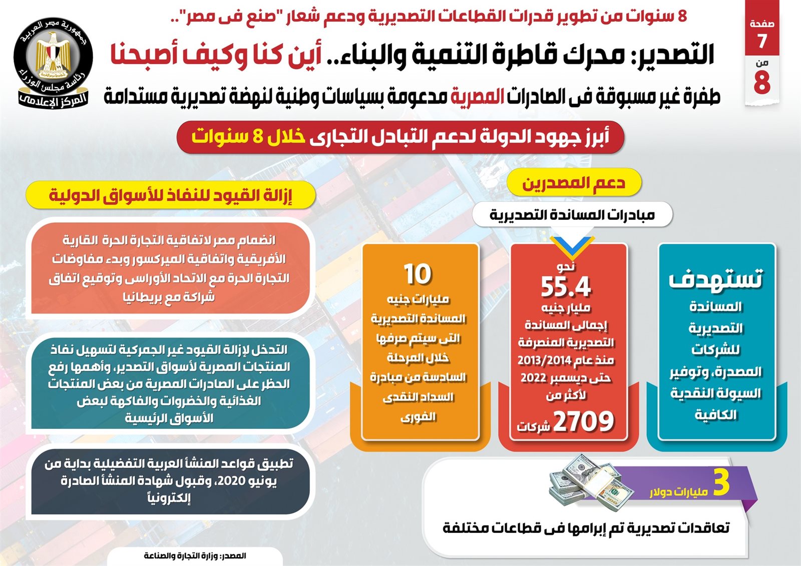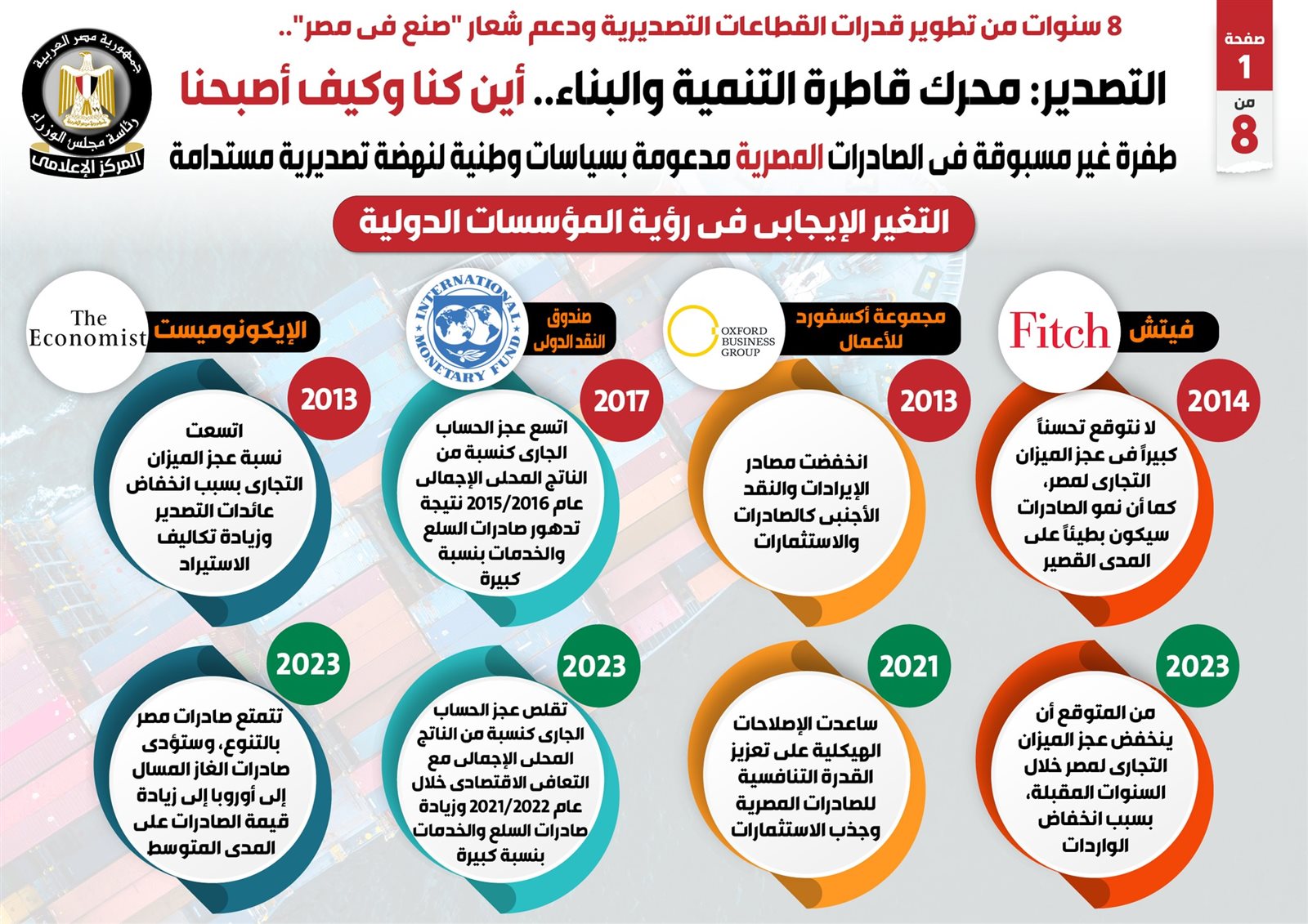 وفي هذا الصدد نشر المركز الإعلامي لمجلس الوزراء تقريراً ضمن سلسلة (أين كنا وكيف أصبحنا) يسلط الضوء من خلال إنفوجرافات على تحقيق الصادرات المصرية طفرة غير مسبوقة مدعومة بسياسات وطنية لنهضة تصديرية مستدامة، وذلك على مدار 8 سنوات من تطوير قدرات القطاعات التصديرية ودعم شعار "صنع في مصر"، باعتبار التصدير محرك قاطرة التنمية والبناء.