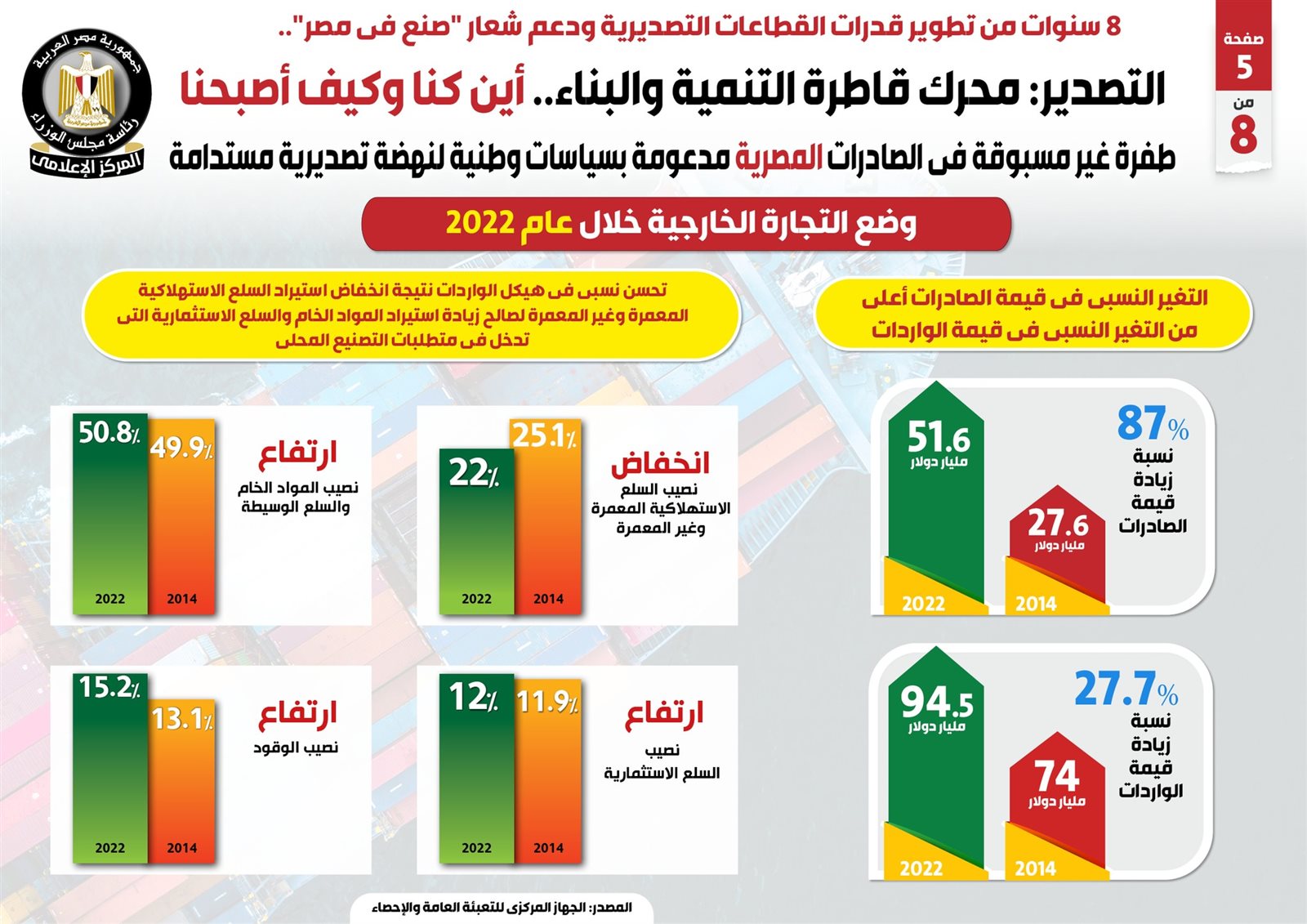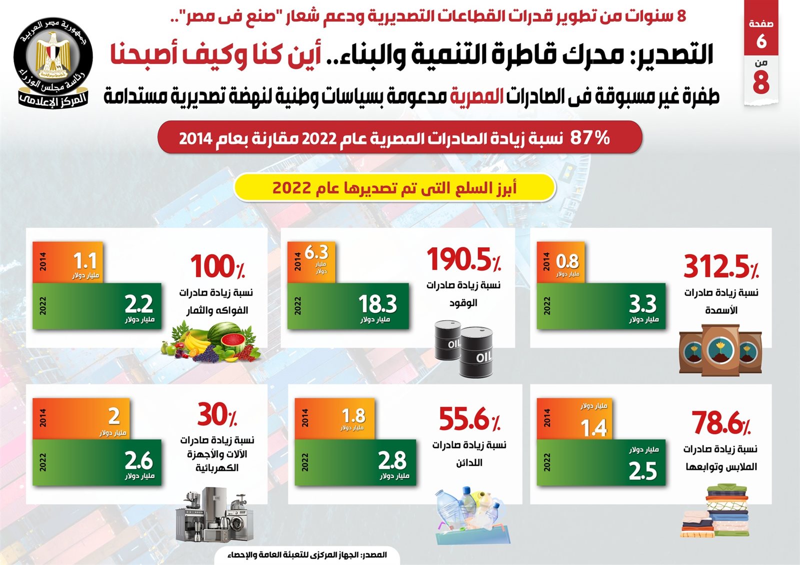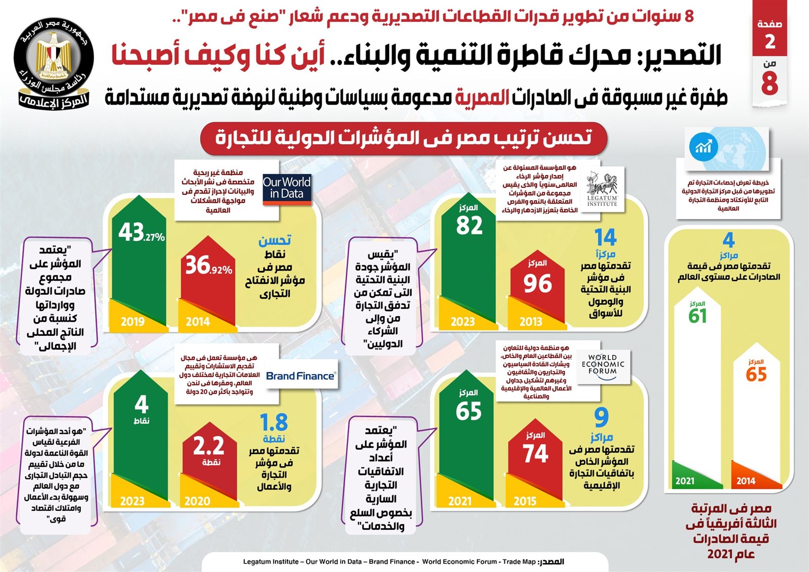 وفي هذا الصدد نشر المركز الإعلامي لمجلس الوزراء تقريراً ضمن سلسلة (أين كنا وكيف أصبحنا) يسلط الضوء من خلال إنفوجرافات على تحقيق الصادرات المصرية طفرة غير مسبوقة مدعومة بسياسات وطنية لنهضة تصديرية مستدامة، وذلك على مدار 8 سنوات من تطوير قدرات القطاعات التصديرية ودعم شعار "صنع في مصر"، باعتبار التصدير محرك قاطرة التنمية والبناء.
