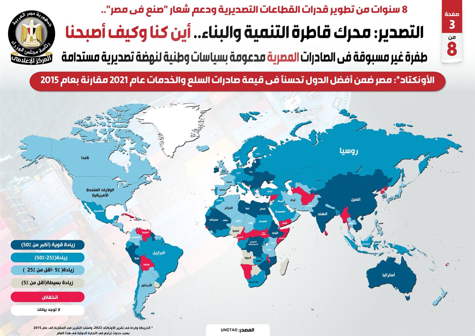 واشار التقرير إلى أن مصر جاءت ضمن أفضل الدول تحسناً في قيمة صادرات السلع والخدمات عام 2021 مقارنة بعام 2015، وذلك وفقاً للأونكتاد.