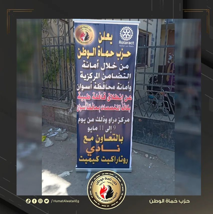 وفي سياق أخر، اجتمع اللواء أشرف عطية محافظ أسوان، مع وفد حزب حماة الوطن، المكون من الدكتورة ناريمان الرفاعي أمانة التضامن المركزية، والنائب ياسين عبد الصبور أمين عام محافظة أسوان بحزب حماة الوطن، وعمرو الجهيني رئيس قطاع خدمة المواطنين بمكتب الأمين العام للحزب، لتوجيه الشكر علي نجاح القافلة الطبية التي نظمها حزب حماة الوطن بمستشفي دارو المركزي بمركز دارو في محافظة أسوان، لتقديم المساعدات الطبية المجانية في جميع التخصصات، بالإضافة لتحمل الحزب تكلفة العمليات الجراحية، ويأتي ذلك في إطار إهتمام حزب حماة الوطن بتنظيم القوافل الطبية المجانية في جميع المحافظات.