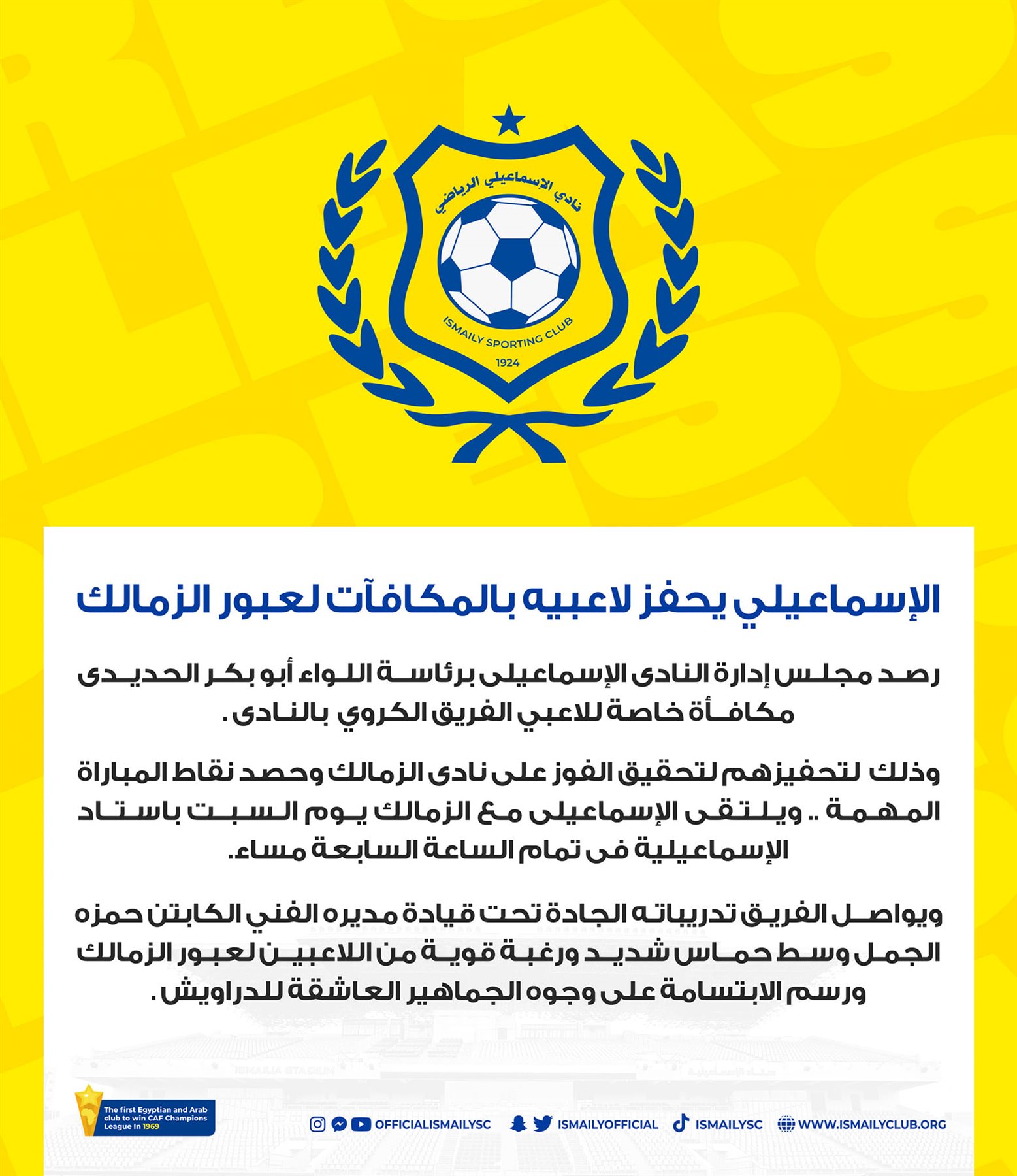 مكافآت خاصة للاعبي الإسماعيلي لتحقيق الفوز على الزمالك