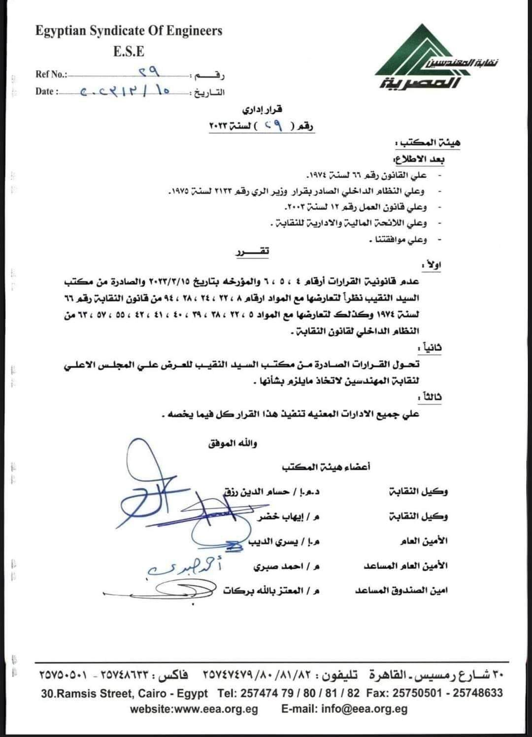 كما تضمن القرار الذي نشره نقيب المهندسين على صفحته الشخصية عبر موقع التواصل الاجتماعي فيس وبوك، أن نقابة المهندسين المصرية تؤكد على عدم الاعتداد بأي مكاتبات أو عقود أو اتفاقيات موقعة من غير نقيب المهندسين أو بموجب تفويضات ملغية.