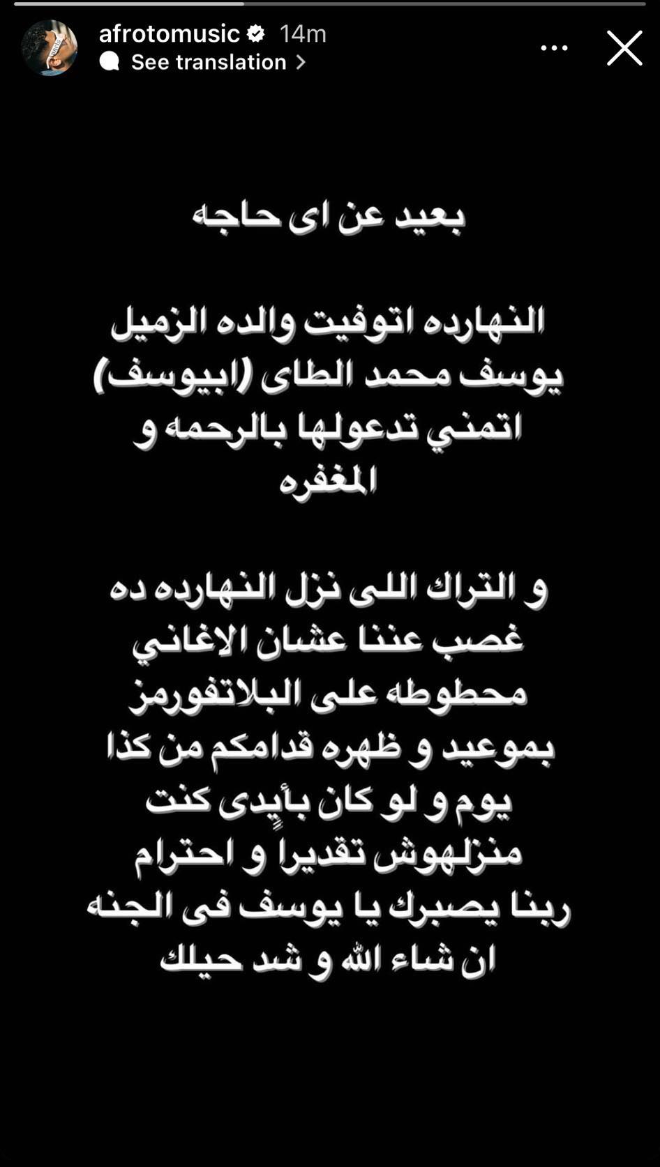 وكتب عفروتو في خاصية الاستوري عبر حسابه بموقع تبادل الصور والفيديوهات انستجرام: بعيدًا عن أي حاجة انهاردة توفت والدة الزميل يوسف محمد الطاي “ أبيوسف” أتمنى تدعولها بالرحمة والمغفرة.