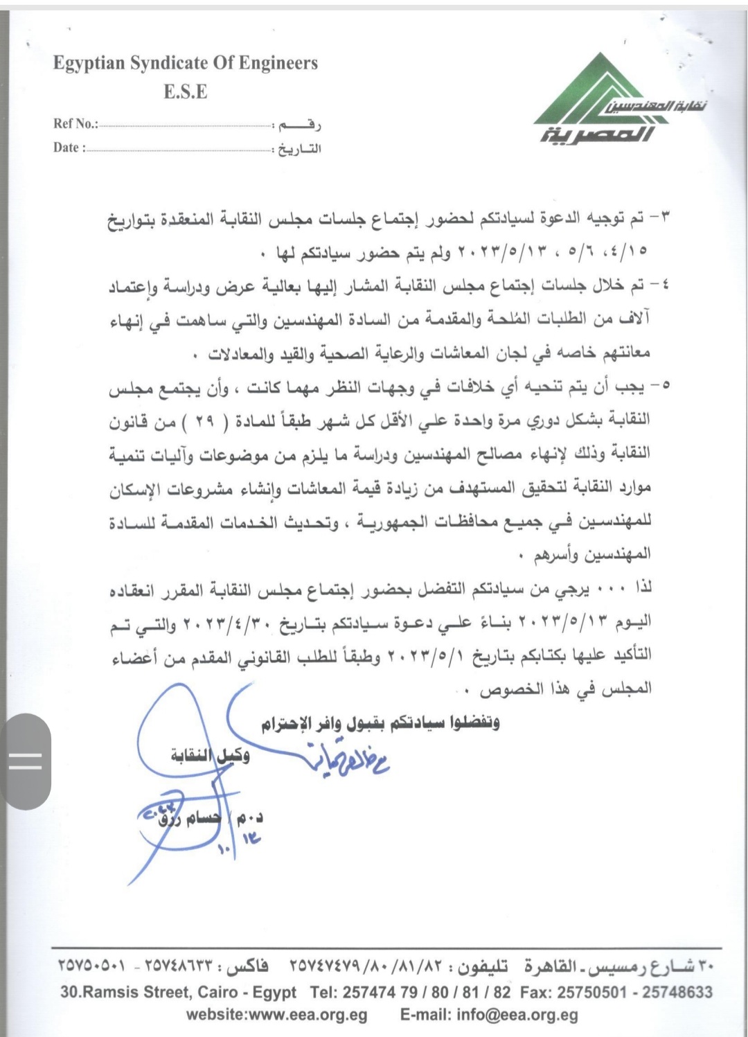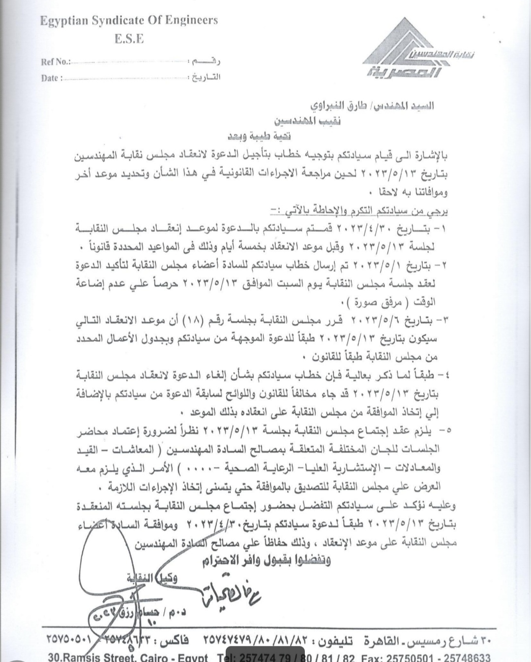 ما تطلب من وكيل نقابة المهندسين الدكتور حسام رزق إلى إرسال خطاب للنقيب العام قائلا: إلغاء الدعوة لانعقاد مجلس النقابة بتاريخ 13-مايو لعام 2023 قد جاء مخالفاً للقانون حيث إن النقيب قد دعا لعقد تلك الجلسة بالإضافة إلي إتخاذ الموافقة من مجلس النقابة على انعقاد الاجتماع بذلك الموعد.