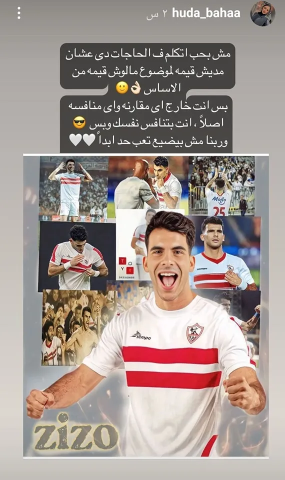 زوجة أحمد سيد "زيزو" عبر ستوري انستجرام: “مش بحب أتكلم في الحاجات دي علشان مديش قيمة لموضوع مالوش قيمة من الأساس.. بس أنت خارج أي منافسة أصلاً.. أنت بتنافس نفسك وبس وربنا مش بيضيع تعب حد ابداً”.