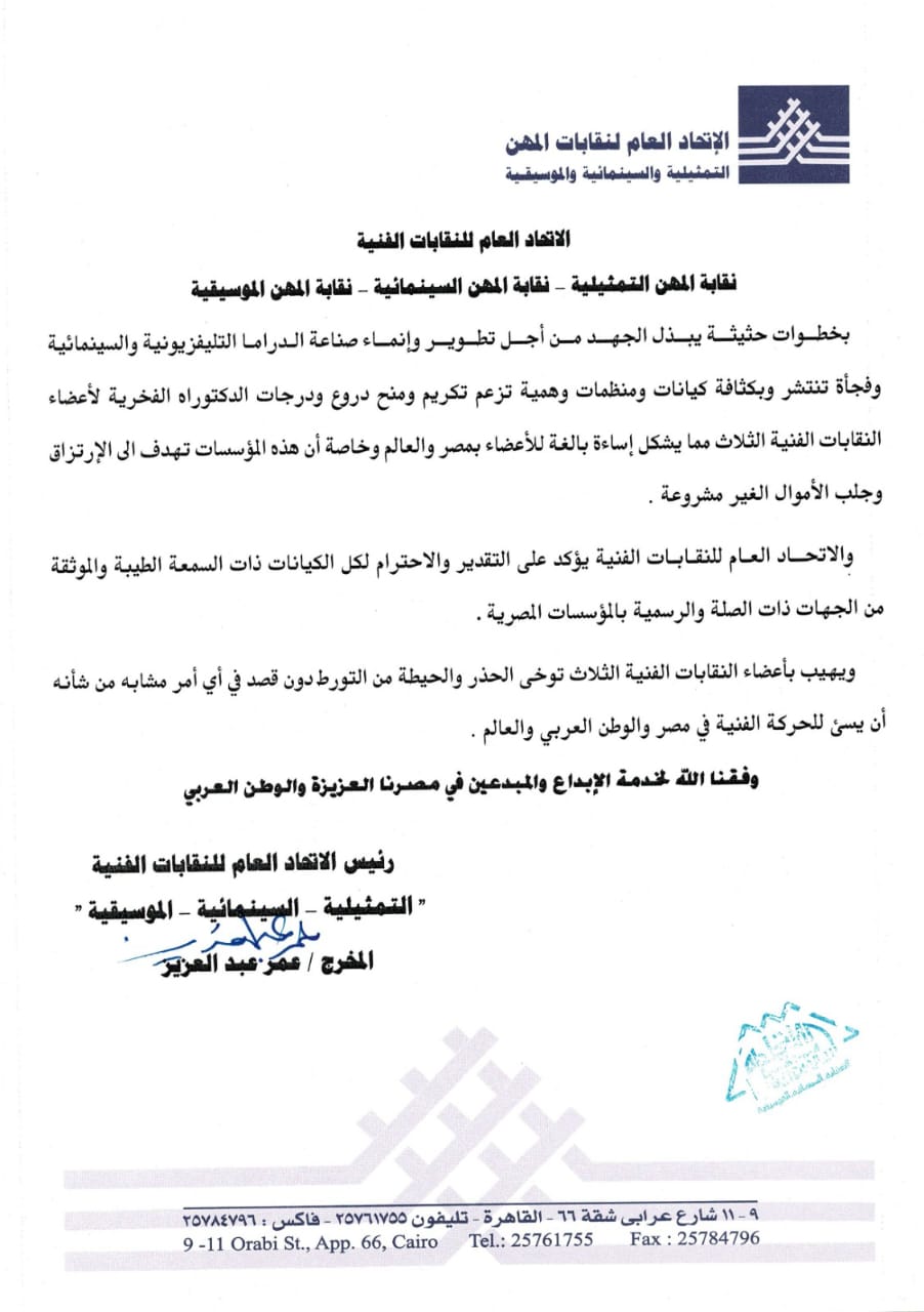 وجاء في البيان: بخطوات حثيثة يبذل الجهد من أجل تطوير وإنماء صناعة الدراما التليفزيونية والسينمائية، و فجأة تنتشر وبكثافة كيانات ومنظمات وهمية تزعم تكريم ومنح دروع ودرجات الدكتوراه الفخرية لأعضاء النقابات الفنية، مما يشكل إساءة بالغة للأعضاء بمصر والعالم، خاصة أن هذه المؤسسات تهدف إلى الارتزاق وجلب الأموال غير المشروعة.