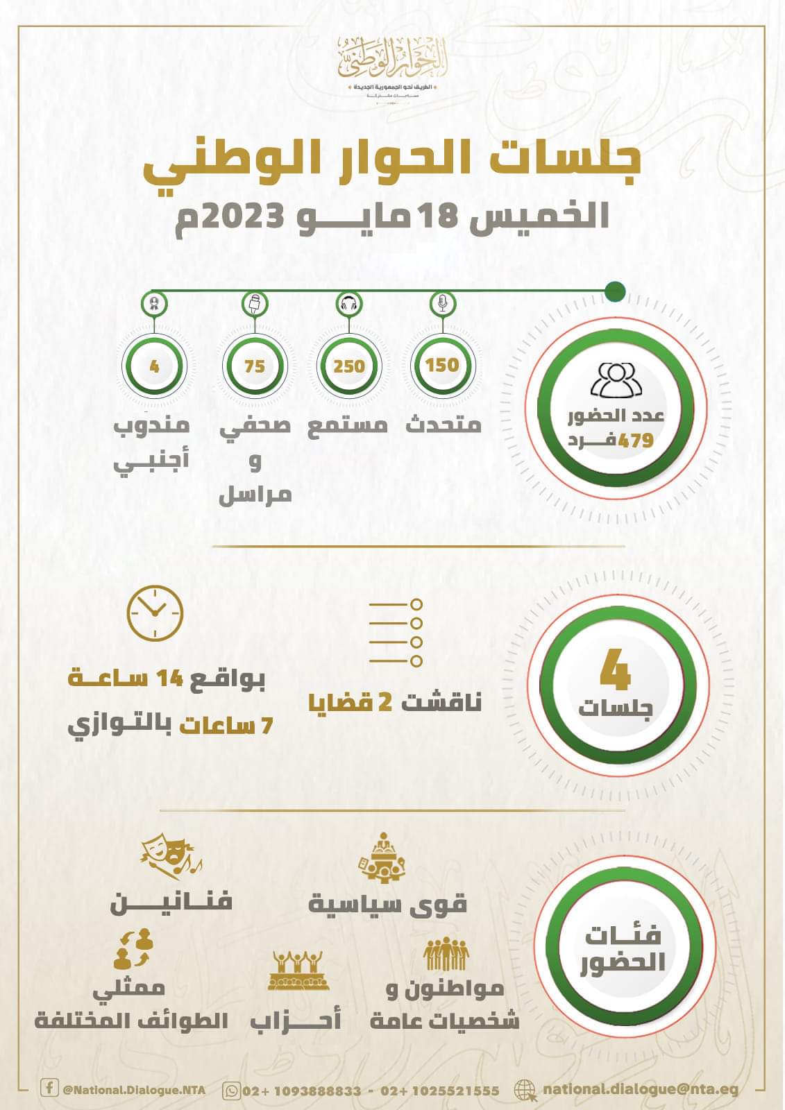 وتستعرض إدارة الحوار أبرز إحصائيات جلسات المحور المجتمعي، يوم الخميس 18 مايو والتي جاءت كالتالي:
