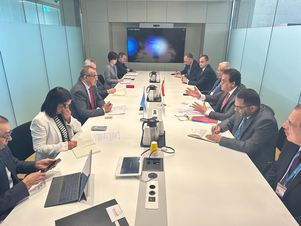 التقى الدكتور خالد عبدالغفار وزير الصحة والسكان، الدكتور تيدروس أدهانوم، المدير العام لمنظمة الصحة العالمية، بحضور السفير الدكتور أحمد إيهاب جمال الدين المندوب الدائم لمصر لدى الأمم المتحدة بجنيف، وذلك بمقر منظمة الصحة العالمية في مدينة جنيف السويسرية، على هامش الاجتماع الـ76 لجمعية الصحة العالمية .