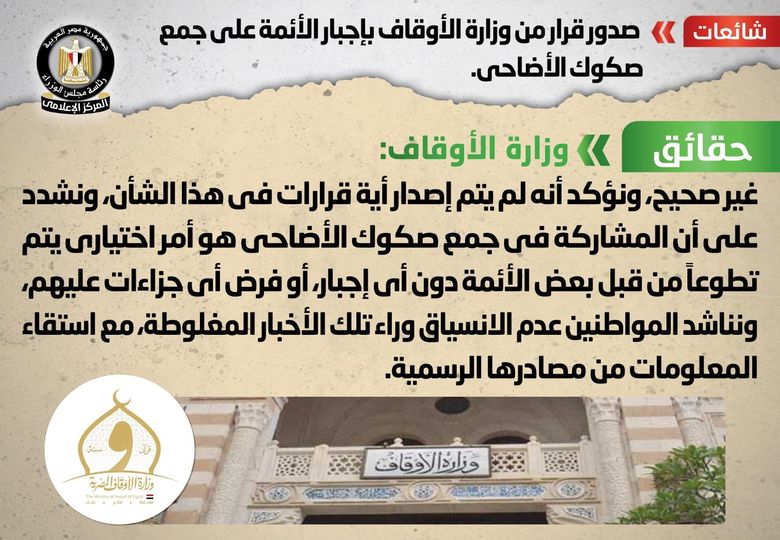انتشر في بعض المواقع الإلكترونية وصفحات التواصل الاجتماعي أنباء بشأن صدور قرار من وزارة الأوقاف بإجبار الأئمة على جمع صكوك الأضاحي، وقد قام المركز الإعلامي لمجلس الوزراء بالتواصل مع وزارة الأوقاف، والتي نفت تلك الأنباء.