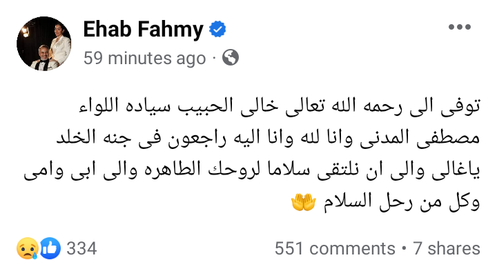 وكتب إيهاب فهمي عبر موقع فيسبوك: توفى الى رحمه الله تعالى خالى الحبيب سياده اللواء مصطفى المدنى وانا لله وانا اليه راجعون فى جنه الخلد ياغالى والى ان نلتقى سلاما لروحك الطاهره والى ابى وامى وكل من رحل السلام.