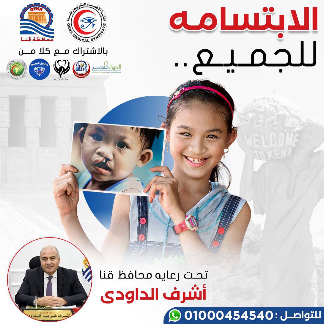 تحت رعاية اللواء أشرف الداودى محافظ قنا ، تعلن نقابة الأطباء بقنا عن إطلاق مبادرة لإجراء عمليات الشفة الأرنبية لأطفال قنا تحت شعار " الإبتسامة للجميع " بالمجان ، وذلك بالتعاون مع مديرية الصحة ، و مؤسسة الدواء للجميع ، و مركز الدكتور جلال حلمى ، و معامل الماسة ، و نقابة صيادلة قنا، بالتنسيق مع نخبة من استشاريين التجميل واستشاريين التخدير والتخصصات المعاونة لإجراء العمليات للأطفال مجانا بمقر مستشفى قنا العام .